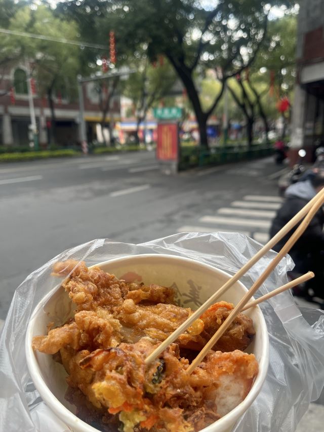 本来是冲着国仔面线去的,大年初二刚开门,排队长的不得了,懒得排队,看到门口这家炸物店排队人少,赶紧选了些东西买单。老板娘给盒子,自己挑,我买了鸡腿,鱼,一个什么卷,然后还有蔬菜饼,一块排骨,总共27块,当早饭吃了。太饱了~