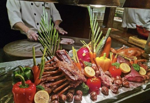 甜点,海鲜,慕斯蛋糕,西冷羊排,榴莲雪梅娘,生鱼片,烟熏三文鱼,寿司,鲜榨果汁,三文鱼三明治,卡布奇诺,奶油泡芙,棉花糖,水果,五谷杂粮汁,面包咖喱牛肉,烤羊排,舒芙蕾