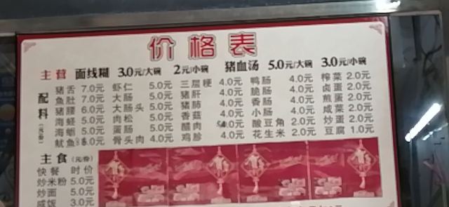 面线糊加大肠醋肉油条,咸饭,面线糊加醋肉加海蛎,面线糊,猪血汤,五香卷,芋头饼,海蛎煎,醋肉