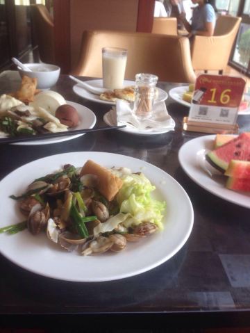 水果,文蛤蒸水蛋,自制酸奶,天妇罗大虾,三文鱼鱼鱼,冰镇芋头糕,羔点,港式鲜虾卷,石锅葱烧海参,烧汁鱿鱼卷,秋葵炒鱼松,素牛肉羹