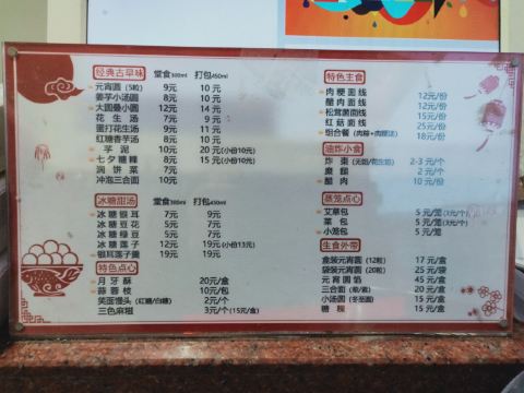 冰糖绿豆,月牙酥,海丝金凤元宵圆,花生汤,槟榔芋泥,蒜蓉枝,醋肉,润饼,面线糊,芋泥,姜汤小汤圆,花生仁汤,煎饼,板栗,粽子,肉羹汤,糯米团,姜芋小汤圆,冰糖豆花,醋肉面线,冰糖银耳,绿豆汤,糜肉追