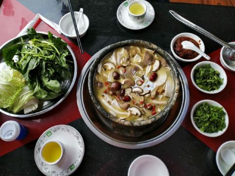 石锅鸡,清蒸波密鱼,红烧牛肉,毛血旺,铁板嫩蛋,干切牦牛肉,地皮炒蛋,回锅肉,醋溜土豆丝,千页豆腐,沸腾鱼,蘑菇烧肉