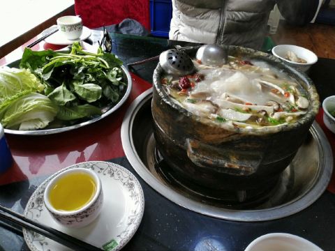 这鸡是 林芝 地区的土鸡,也叫“藏鸡”。打捞了一下,汤里还有何首乌、当归、天麻、百合等,其中还有一种手掌形状的东西——“手掌参”。店家还配了蔬菜、豆腐、香菇等,让我们涮着吃,跟平常吃火锅差不多。