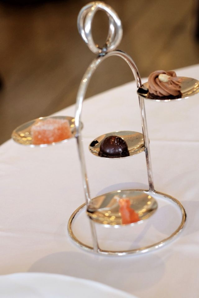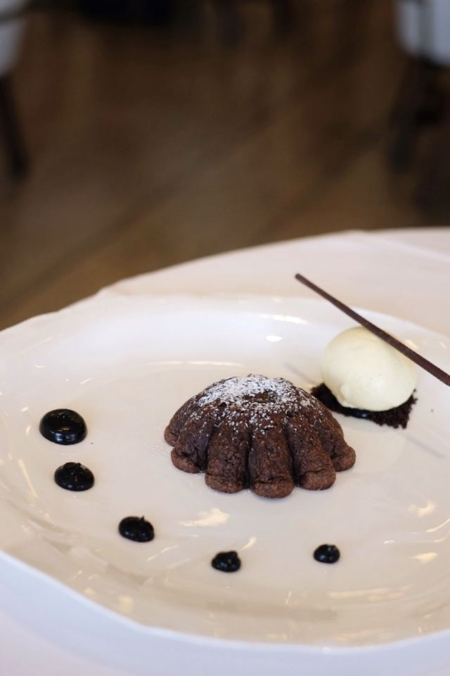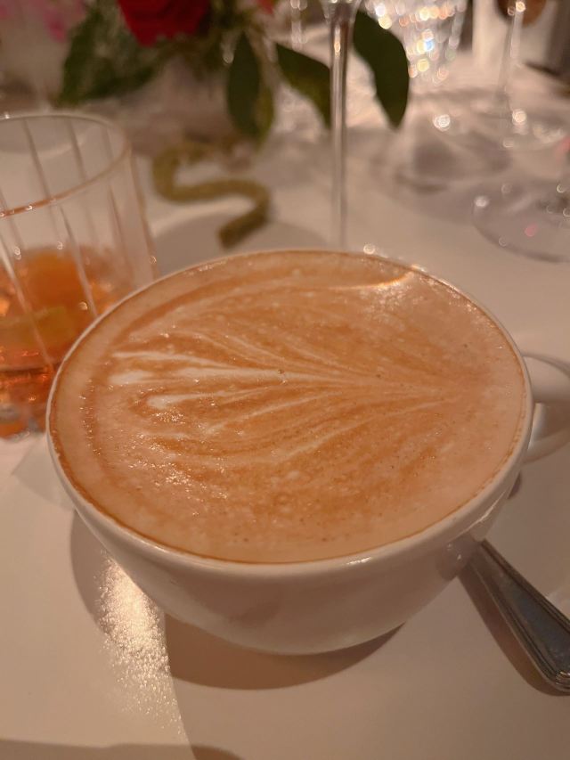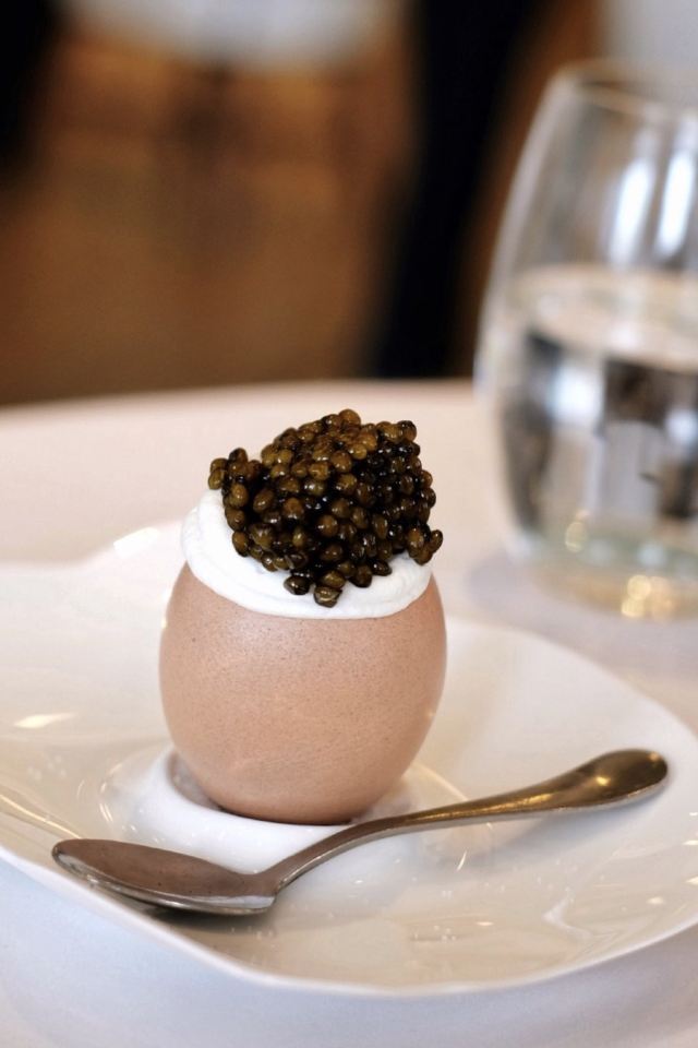 JEAN-GEORGES午市三道式套餐,部分菜品需要额外加价,我们算上服务费最后人均80美刀出头,性价比就见仁见智啦。 ▹有机鸡蛋鱼子酱 一颗标志性的蛋,JG多年不变的头牌。将整颗蛋挖空,再依次放入炒蛋、奶油、鱼子酱,自上而下一勺到底挖出3个层次,鱼子酱入口后率先一粒一粒爆裂出鲜香,伏特加调味过的奶油轻盈香滑,一成熟的炒蛋空气感十足,温热咸香,搭配出奇妙却和谐的滋味。 ▹法式鹅肝酱 香脆的糖衣开心果和酸樱桃果干topping,一层薄脆的烤焦糖,鹅肝酱细腻香滑,吐司略湿软不喜欢,反倒是旁边的白波特酒冻能够把鹅肝香气衬得更丰腴醇厚。 ▹香扒比目鱼配翡翠奶油汁 去皮比目鱼排焗烤到表面微酥鱼肉滑嫩,酱汁调味寡淡,配鱼还是喜欢略带酸感的。 ▹炙烤乳鸽佐旱金莲花醋汁 乳鸽裹上香料腌烤至五分熟,肉质恰到好处的软嫩肥美。旱金莲花酱汁是第一次吃,知道是醋汁所以做好了酸的心理准备,但是没想到还是被酸得五官打结。。。刺激! ▹青椰子冻糕配热带水果 最想吃的甜品,一点没失望!冻糕球用青柠凝露和菠萝冰霜固定在盘子上,敲开以后露出里面满满的水果,冰凉酸甜清爽得仿佛一口来到了夏天! ▹巧克力蛋糕配香草冰淇淋 熔岩蛋糕没什么稀奇的,但是就是这个丑丑的熔岩蛋糕竟然是JG的招牌甜品,让我反而有了兴趣。切开松软的糕体,里面的巧克力流心以一种几乎静止的速度向外缓缓流动,带着巧克力特有的苦香,配上香草冰淇淋,一冷一热融化在口中,冰火两重天的香甜浓醇是会让人忘记卡路里的。