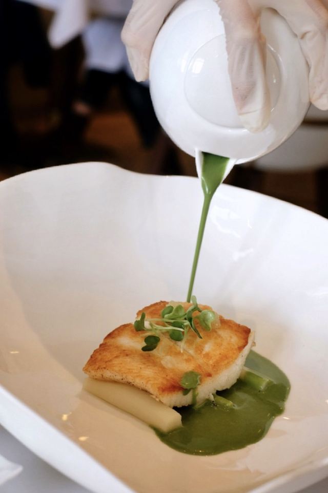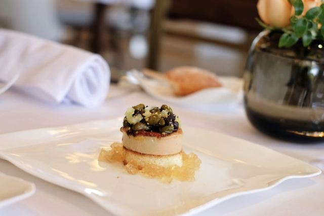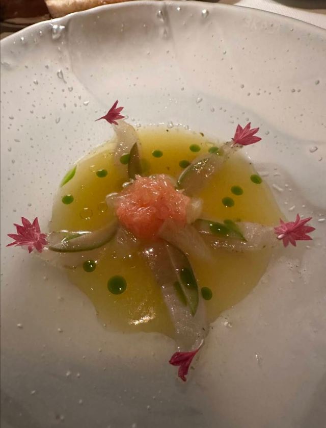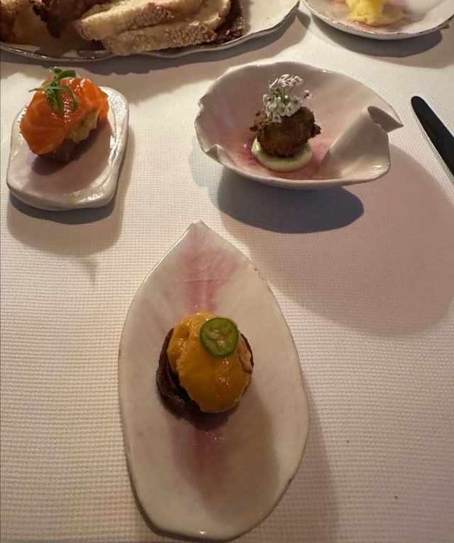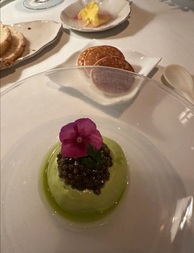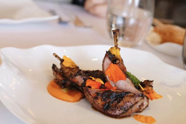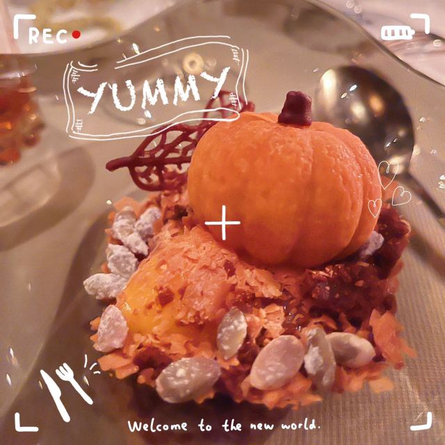 摆渡修行午市三道式套餐,部分菜品需要额外加价,我们算上服务费最后人均80美刀出头,性价比就见仁见智啦。 ▹有机鸡蛋鱼子酱 一颗标志性的蛋,JG多年不变的头牌。将整颗蛋挖空,再依次放入炒蛋、奶油、鱼子酱,自上而下一勺到底挖出3个层次,鱼子酱入口后率先一粒一粒爆裂出鲜香,伏特加调味过的奶油轻盈香滑,一成熟的炒蛋空气感十足,温热咸香,搭配出奇妙却和谐的滋味。 ▹法式鹅肝酱 香脆的糖衣开心果和酸樱桃果干topping,一层薄脆的烤焦糖,鹅肝酱细腻香滑,吐司略湿软不喜欢,反倒是旁边的白波特酒冻能够把鹅肝香气衬得更丰腴醇厚。 ▹香扒比目鱼配翡翠奶油汁 去皮比目鱼排焗烤到表面微酥鱼肉滑嫩,酱汁调味寡淡,配鱼还是喜欢略带酸感的。 ▹炙烤乳鸽佐旱金莲花醋汁 乳鸽裹上香料腌烤至五分熟,肉质恰到好处的软嫩肥美。旱金莲花酱汁是第一次吃,知道是醋汁所以做好了酸的心理准备,但是没想到还是被酸得五官打结。。。刺激! ▹青椰子冻糕配热带水果 最想吃的甜品,一点没失望!冻糕球用青柠凝露和菠萝冰霜固定在盘子上,敲开以后露出里面满满的水果,冰凉酸甜清爽得仿佛一口来到了夏天! ▹巧克力蛋糕配香草冰淇淋 熔岩蛋糕没什么稀奇的,但是就是这个丑丑的熔岩蛋糕竟然是JG的招牌甜品,让我反而有了兴趣。切开松软的糕体,里面的巧克力流心以一种几乎静止的速度向外缓缓流动,带着巧克力特有的苦香,配上香草冰淇淋,一冷一热融化在口中,冰火两重天的香甜浓醇是会让人忘记卡路里的。