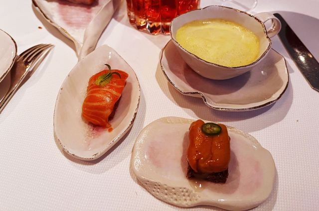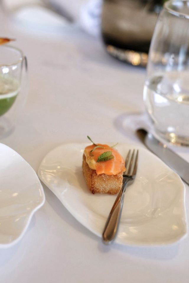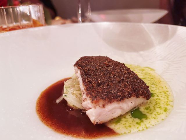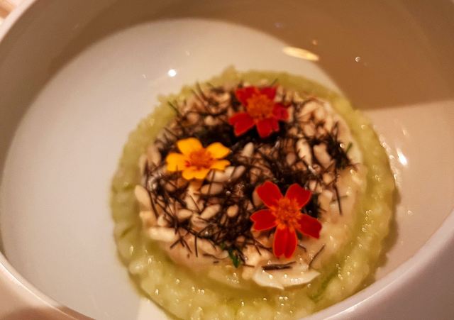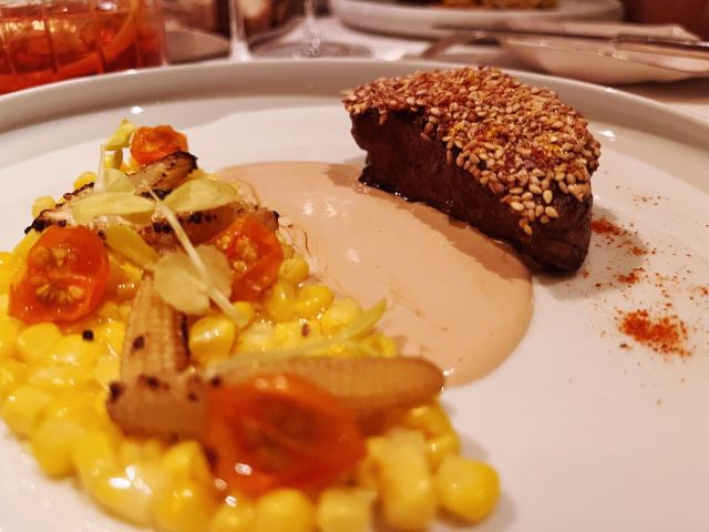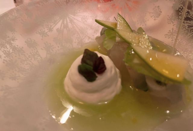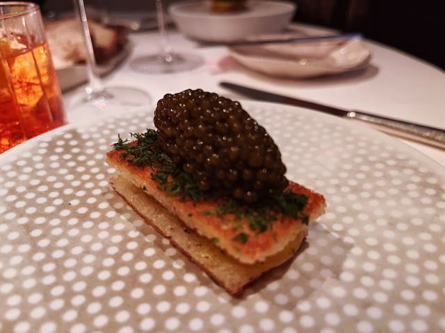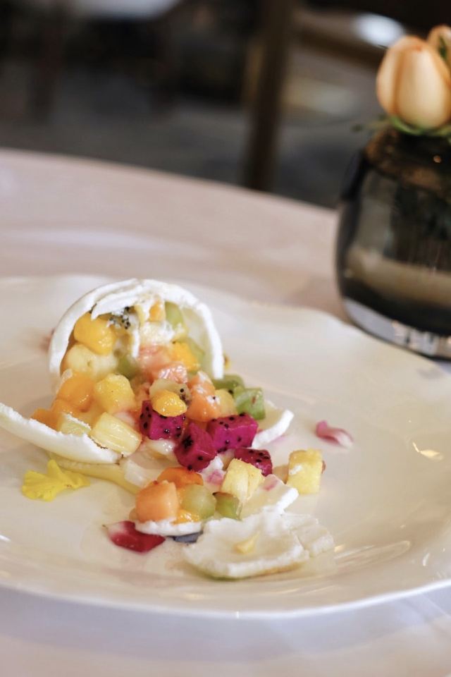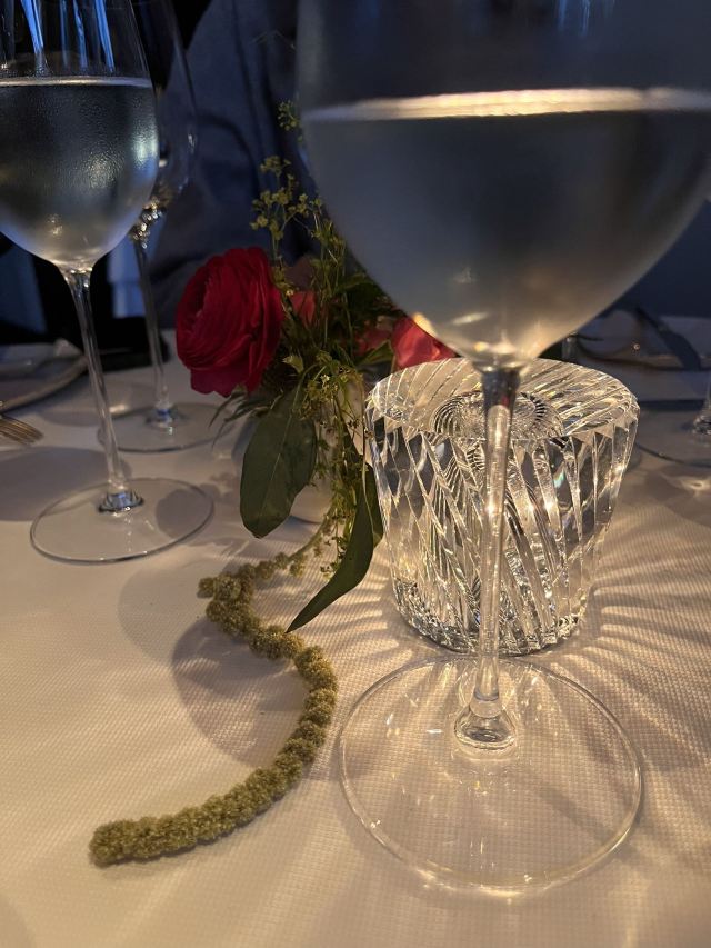 摆渡修行午市三道式套餐,部分菜品需要额外加价,我们算上服务费最后人均80美刀出头,性价比就见仁见智啦。 ▹有机鸡蛋鱼子酱 一颗标志性的蛋,JG多年不变的头牌。将整颗蛋挖空,再依次放入炒蛋、奶油、鱼子酱,自上而下一勺到底挖出3个层次,鱼子酱入口后率先一粒一粒爆裂出鲜香,伏特加调味过的奶油轻盈香滑,一成熟的炒蛋空气感十足,温热咸香,搭配出奇妙却和谐的滋味。 ▹法式鹅肝酱 香脆的糖衣开心果和酸樱桃果干topping,一层薄脆的烤焦糖,鹅肝酱细腻香滑,吐司略湿软不喜欢,反倒是旁边的白波特酒冻能够把鹅肝香气衬得更丰腴醇厚。 ▹香扒比目鱼配翡翠奶油汁 去皮比目鱼排焗烤到表面微酥鱼肉滑嫩,酱汁调味寡淡,配鱼还是喜欢略带酸感的。 ▹炙烤乳鸽佐旱金莲花醋汁 乳鸽裹上香料腌烤至五分熟,肉质恰到好处的软嫩肥美。旱金莲花酱汁是第一次吃,知道是醋汁所以做好了酸的心理准备,但是没想到还是被酸得五官打结。。。刺激! ▹青椰子冻糕配热带水果 最想吃的甜品,一点没失望!冻糕球用青柠凝露和菠萝冰霜固定在盘子上,敲开以后露出里面满满的水果,冰凉酸甜清爽得仿佛一口来到了夏天! ▹巧克力蛋糕配香草冰淇淋 熔岩蛋糕没什么稀奇的,但是就是这个丑丑的熔岩蛋糕竟然是JG的招牌甜品,让我反而有了兴趣。切开松软的糕体,里面的巧克力流心以一种几乎静止的速度向外缓缓流动,带着巧克力特有的苦香,配上香草冰淇淋,一冷一热融化在口中,冰火两重天的香甜浓醇是会让人忘记卡路里的。