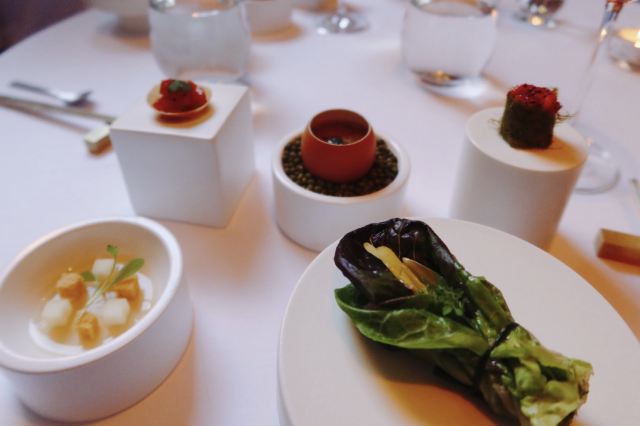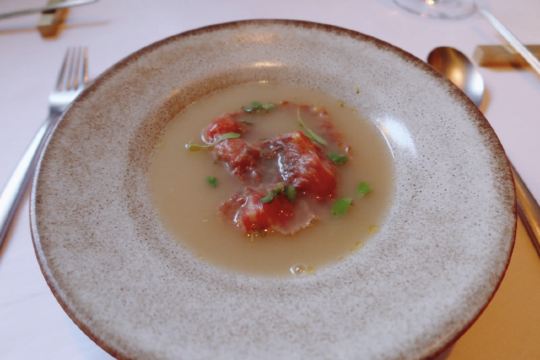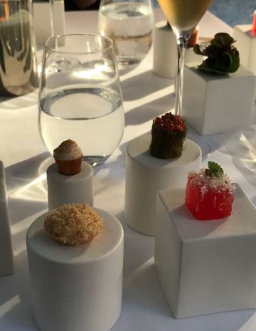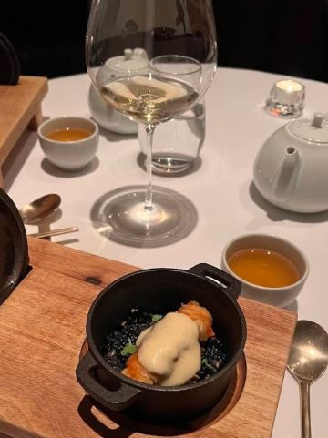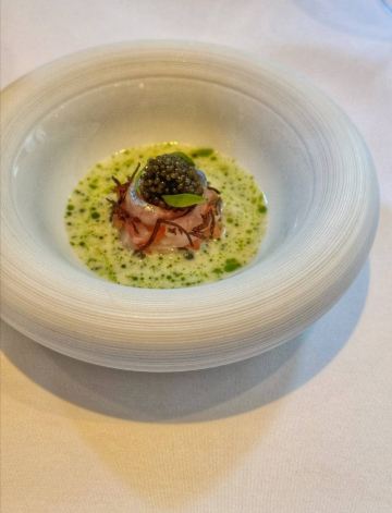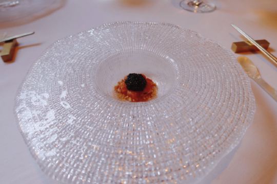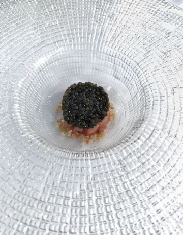摆渡修行点了9道的Signature Tasting Menu 前菜组合: 鹅肝慕斯, 吞拿塔塔, 松露炖蛋, 牛肉塔塔, 生菜卷 第一道:鱼子酱OSETRA CAVIAR 第二道:鹅肝饺子FOIE GRAS MANDOO 第三道:炸章鱼OCTOPUS 第四道:烤鲈鱼BRANZINO 第五道:金枪鱼松露手卷TUNA KIMBAP 第六道:和牛GALBI 第七道:菠萝鸡尾酒PINEAPPLE COCKTAIL 第八道:香蕉BABY BANANA 第九道:豆味冰激凌SOY-BALHYO 第一道:绵密腴滑的吞拿鱼腹和咸鲜爆浆鱼子酱的完美结合,怎么会不好吃![坏笑][坏笑] 第二道:鹅肝饺子藏在和牛片下,和汤清味美的骨汤一起下肚,是秋冬的治愈系 第五道:松脆的海苔卷里填满了蓝鳍金枪鱼和松露米饭,入口脂香四溢,肥腴柔润甜美,盘子上还点缀着一点辣芥末酱,全场最佳!