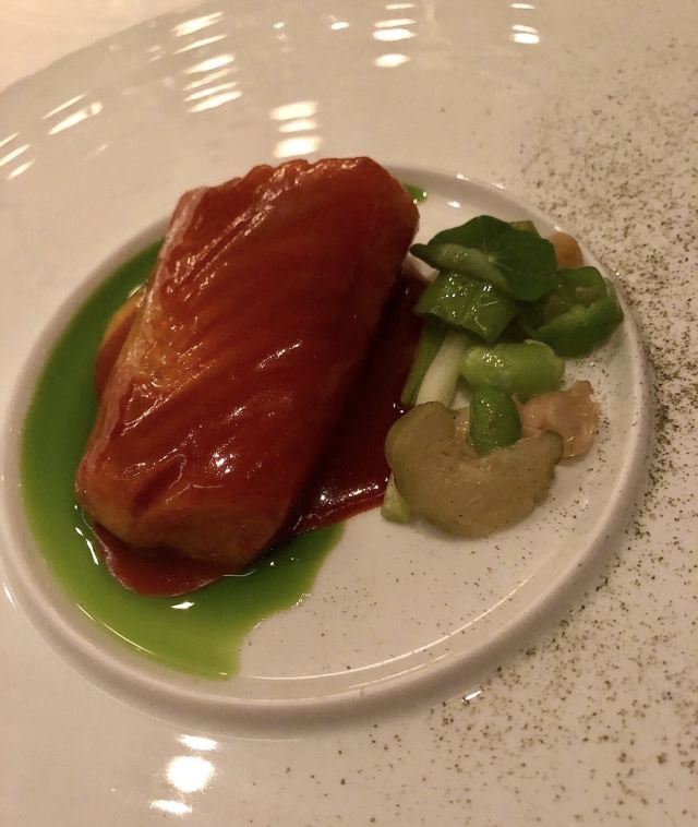Jungsik点了9道的Signature Tasting Menu 前菜组合: 鹅肝慕斯, 吞拿塔塔, 松露炖蛋, 牛肉塔塔, 生菜卷 第一道:鱼子酱OSETRA CAVIAR 第二道:鹅肝饺子FOIE GRAS MANDOO 第三道:炸章鱼OCTOPUS 第四道:烤鲈鱼BRANZINO 第五道:金枪鱼松露手卷TUNA KIMBAP 第六道:和牛GALBI 第七道:菠萝鸡尾酒PINEAPPLE COCKTAIL 第八道:香蕉BABY BANANA 第九道:豆味冰激凌SOY-BALHYO 第一道:绵密腴滑的吞拿鱼腹和咸鲜爆浆鱼子酱的完美结合,怎么会不好吃![坏笑][坏笑] 第二道:鹅肝饺子藏在和牛片下,和汤清味美的骨汤一起下肚,是秋冬的治愈系 第五道:松脆的海苔卷里填满了蓝鳍金枪鱼和松露米饭,入口脂香四溢,肥腴柔润甜美,盘子上还点缀着一点辣芥末酱,全场最佳!