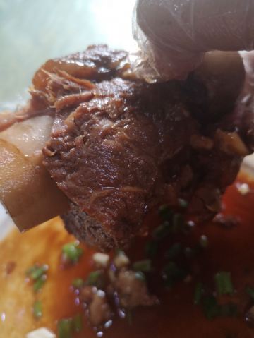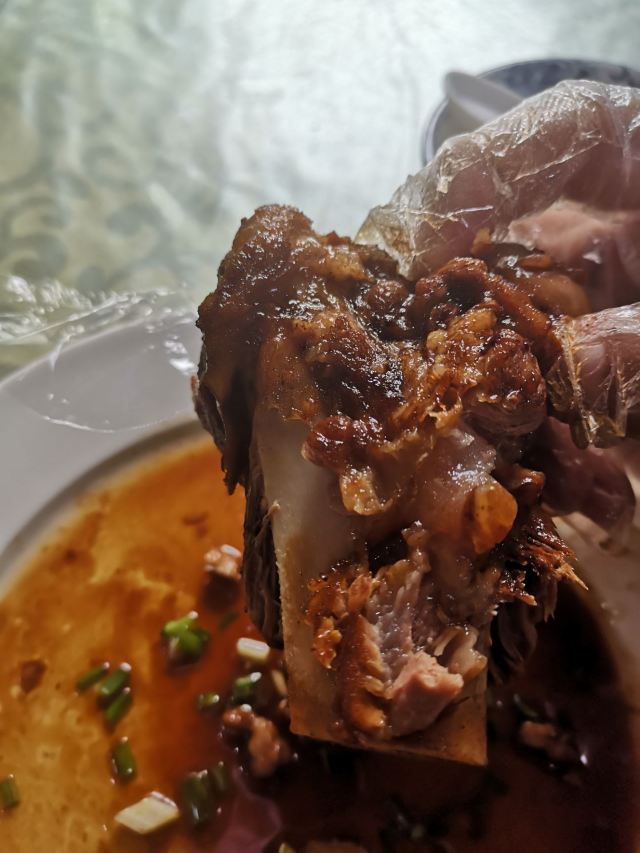 这家店还是非常好找,也比较显眼儿,店里面的环境不错,挺干净,服务周到。酱大骨头特别好吃,给的量也比较足。再配上点儿小饼和稀饭。
