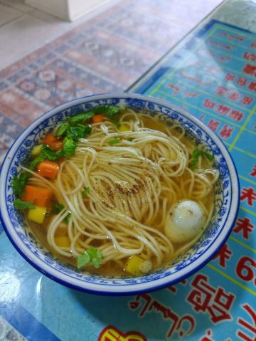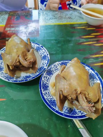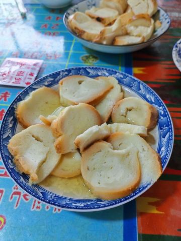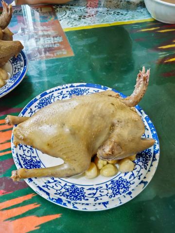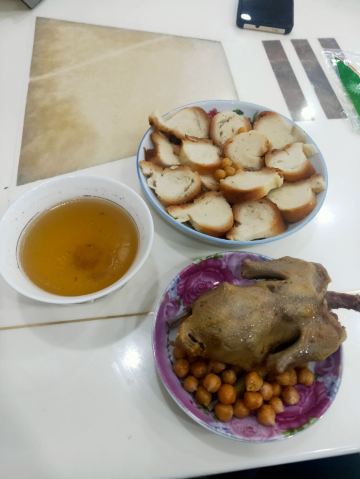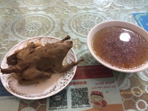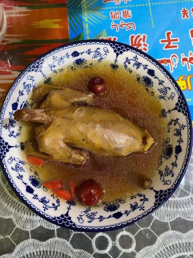 喀什古城周边的美食不少,所以酒店就别定早餐了,一定要体验一下当地的特色美食!在喀什很少能看到鸡的料理,但是鸽子料理特别是鸽子专门店不在少数,这里号称没有一只鸽子能飞出喀什的。鸽子营养和药用价值较高,中国古话说“一鸽胜九鸡”。鸽子的肉、卵、粪均能入药,鸽肉性平、味咸,具有补肾、益气、养血、祛风、解毒等功效。搜了一下这家离酒店比较近的鸽子专门店,门头不是太大,店面干干净净,店内就一位维族大娘看守。早餐没有烤鸽子等料理,有鸽子面和鸽子汤。鸽子汤上来的时候,鸽子是捞出来单独放的,看起来非常肥美。鸽子面是素面,里面放了一个鸽子蛋,大小和鹌鹑蛋差不多。馕是经过鸽子汤泡过的,软糯吸取鸽子汤的鲜味,非常的好吃。