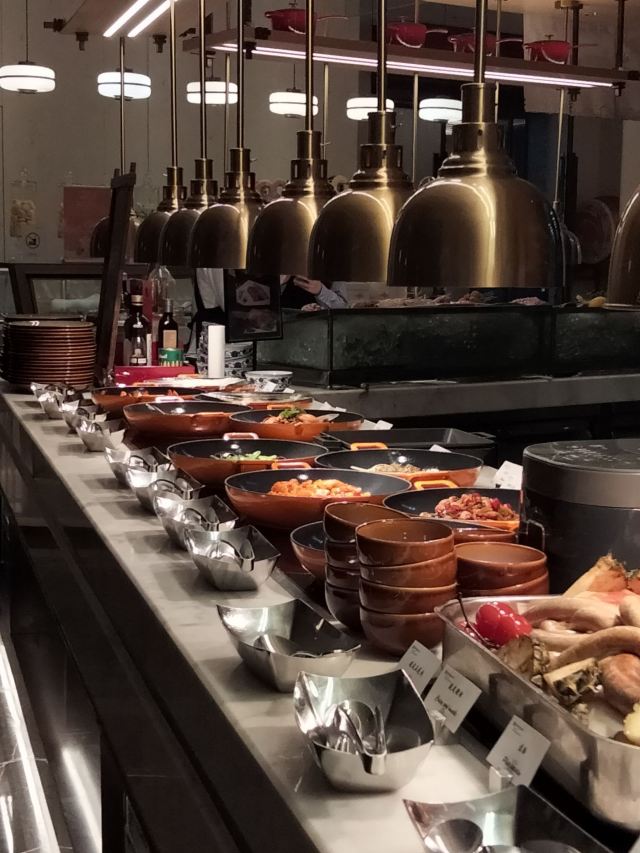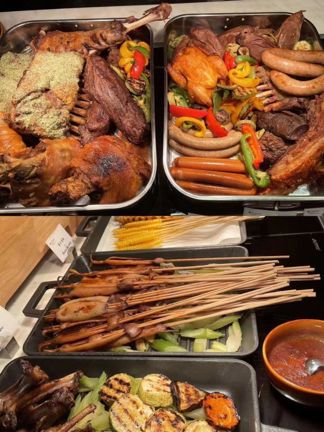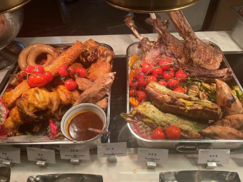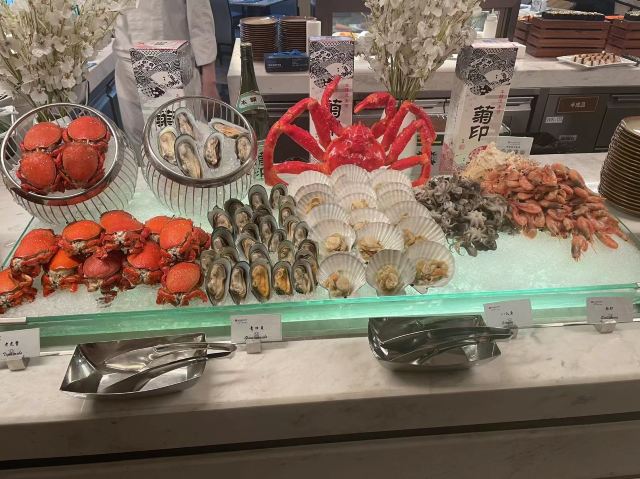菜品:一进餐厅的位置有各种美味的小吃,像凉皮,关东煮,烤冷面,手抓饼等等,还有烤串羊排,小龙虾有四种口味挺全的,酒醉小龙虾感觉非常好吃,热菜方面既有中式热菜又包含西式热菜,还有一个全是肉类的档口,海鲜种类也挺齐全,有即食的海鲜也有现炒的辣炒小海鲜,还包含了刺身三文鱼等等,总的来说菜品方面比较齐全,饮品有现榨西瓜汁,还有各种罐装饮料 环境:用餐环境很优雅,有靠近窗户的边卡座还有沙发坐,如果人多的话餐厅还有一个包间,挺不错 服务:服务上没得说,核销完以后,有专人带位介绍菜品,带到座位以后餐厅内的服务员会主动的询问想吃的菜品然后帮忙取餐,服务超级棒👍🏻