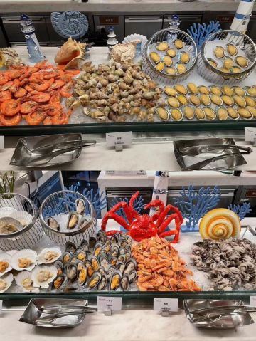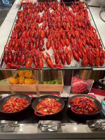 YoYo_8U3U3C2A餐厅的早餐非常的丰富属于中西结合 甜品 中式热菜 西式热菜 现做的华夫饼🧇法式薄饼 还有手抓饼都很好吃 还有各种新鲜水果 🍊各式沙拉🥗 饮品种类很多有鲜榨的西瓜🍉汁 黄瓜汁 还有各种的茶 还有现磨的咖啡☕呦 对于一个北方人来说早上来一碗热乎乎的面条🍜 或者混沌那真是太棒了. 还有豆腐脑配油条也是绝配 如果大家晚上不想出去吃饭的话可以尝试一下西餐厅的晚餐 对于住店的客人酒店前台会提供晚餐优惠券的 晚餐的菜品丰盛又新鲜呦。可以选择的种类很多。一进门就是各种的甜品小点心对于甜食控来说真的太满足啦,还有各种加工好的冰镇小海鲜 可以加热奥 ,晚上的饮品区还增加了红白葡萄酒还有各类啤酒和饮料🥤,还有不限量的各种刺身 战斧羊排 羊排 四种口味的小龙虾 烤串 热菜 烧腊 ,还有好多小吃比如米线 凉皮 花甲粉 真的吃不过来了 。最重要每人一份的派送菜 芝士焗波士顿龙虾🦞真的太值了。最后可以来一份冰淇淋🍦来最为这顿晚餐的结尾。满足各类人群的味蕾。服务人员的态度都很好呦✨非常的贴心