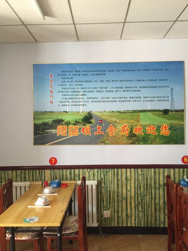 草原天路自驾游玩,品味当地特色美食请到阿芳,坝上食府总店,有烤全羊,烤羊腿烤羊排,手把肉,奶茶,蒙古蒸饺,一品莜面,各种各样的小凉菜,还有家常菜,炖菜,山野菜,品种齐全啊! 【口味】很棒 【环境】很好很好很好 【服务】很热情