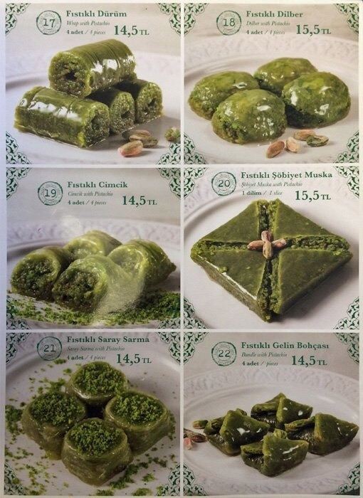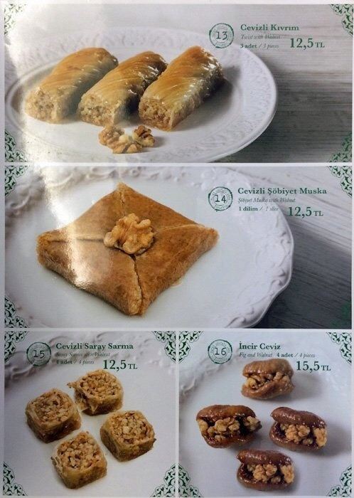 玉米面包,特雷斯蛋糕,草莓蛋糕,开心果千层酥,海绵蛋糕,芝士蛋糕,牛奶布丁,焦糖布丁,诺亚方舟布丁,土耳其茶,土耳其咖啡,土耳其软糖,土耳其果仁点心
