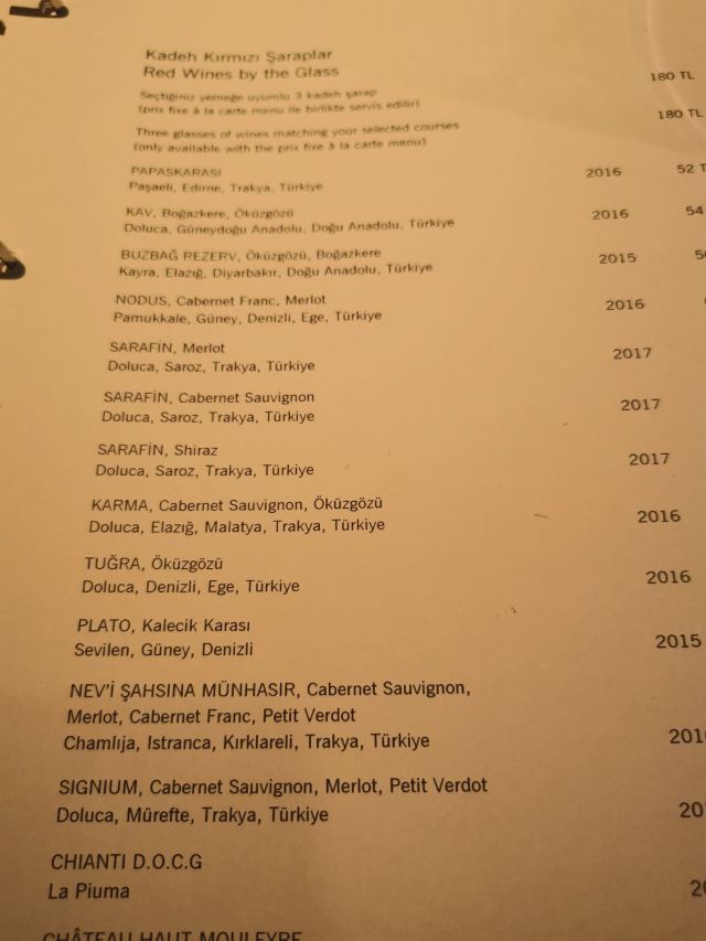 FRIVOLITA就获奖餐厅而言,我觉得有些过誉,或许我期待过高。比如一道羊肉,做得有点柴了,而且吃起来像鸭肉,没有羊肉的味道了。 在你开始正餐之前,倒是送来一堆bite sized小食,看起来蛮丰富的,但是味道都比较普通,感觉不出什么当地特色,在熟悉的风味里也不突出。 尝了两款土耳其本地葡萄的红葡萄酒,中规中矩,一款酒体较单薄,另一款丹宁更为厚重。 伊斯坦布尔的服务员讲起英文来口音极重,但极为流利,因此很难听懂,即使再问他也不会放慢说。 好在景观很好,那里吃饭不是游客,就是约会或者聚会。冲着风景去是可以的,but again,如果只是去看看风景,有个诀窍就是坐电梯到顶楼后在走楼梯上一层是露天酒吧,喝一杯拍拍照也就可以了。