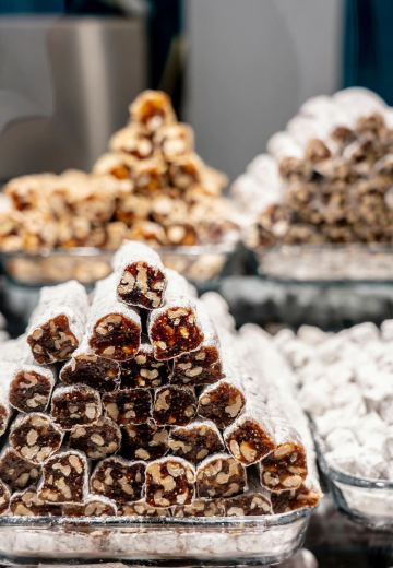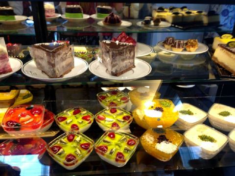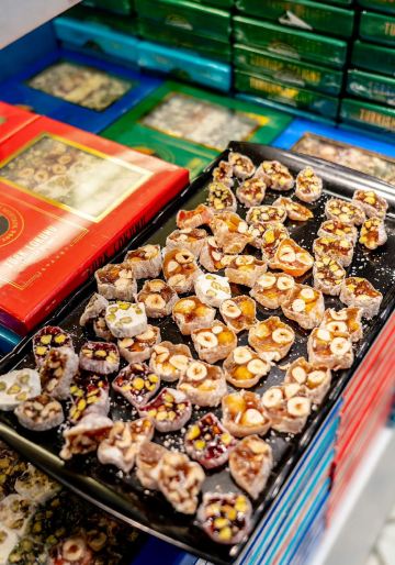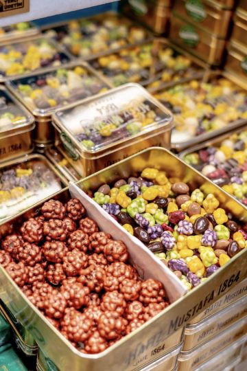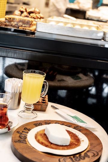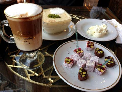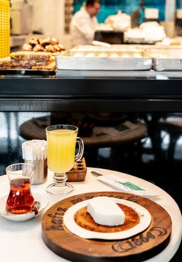 伊斯坦布尔最有名的国民百年甜品店Hafiz Mustafa,店内几乎包含土耳其所有口味的软糖,巴克拉瓦甜点[飞镖黄跳舞] 点了一份特色甜品库纳法kunefe,用面皮做的长细面条加入了生牛奶奶酪和糖浆,外皮烤的脆脆的,里面又很香软,加了香草冰淇淋,吃起有些甜但是夹着香气的组合很微妙,点一杯土耳其茶或者柠檬汁刚刚好