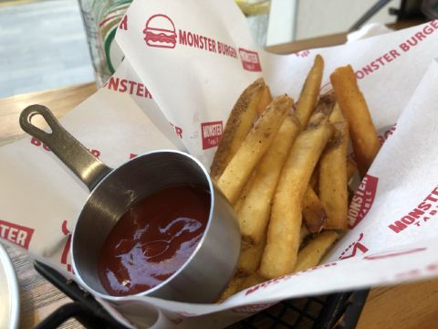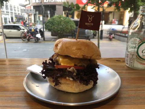 monster店面不是很大,坐落在路边,一一大面靠路边的落地窗,非常透彻。 里边风格非常没事,木桌子、木椅子、铁丝网、操作台,简单,干净、粗犷。 要了和牛大汉堡和大薯条。汉堡的面包烤得真好到位,温温的不焦还有麦香,牛肉也有韧劲,好吃。 薯条,哇,不脆但有型,入口粉粉的,味道好极了。 这家路边小店使得我恍然之间不在深圳 而是在一个生活烟火的安静小城。