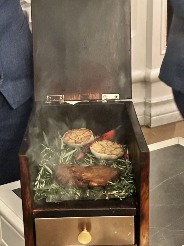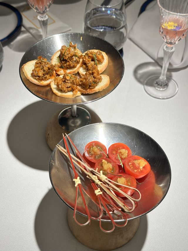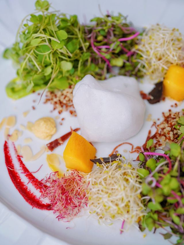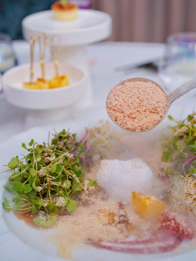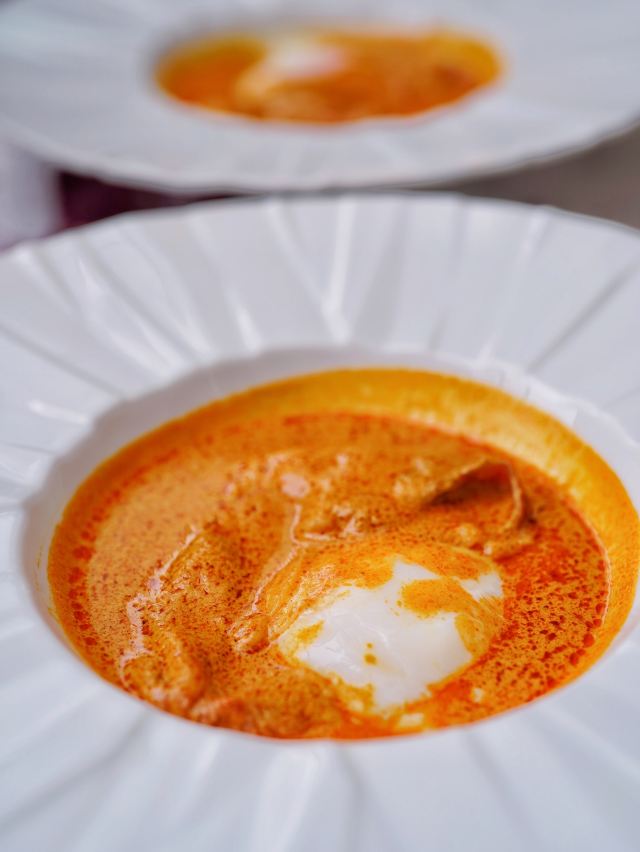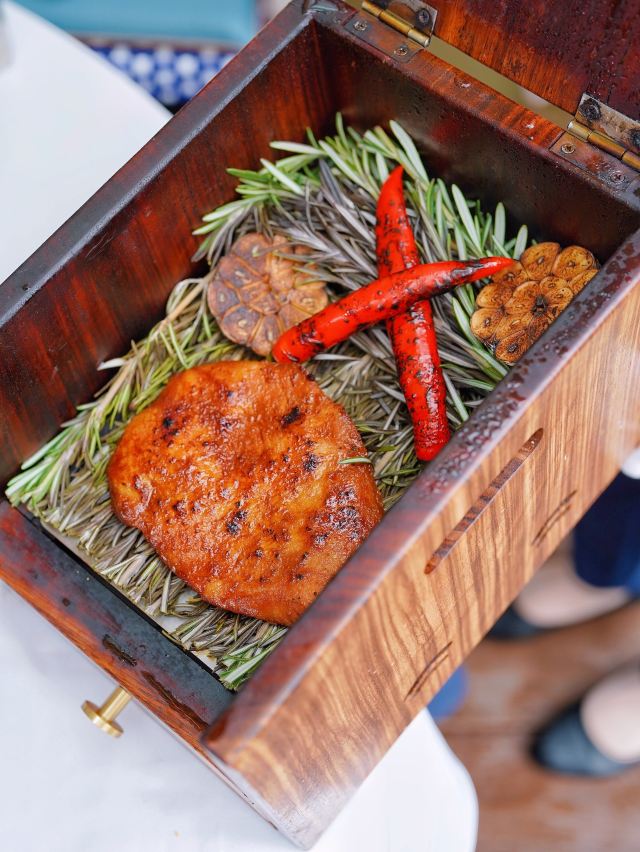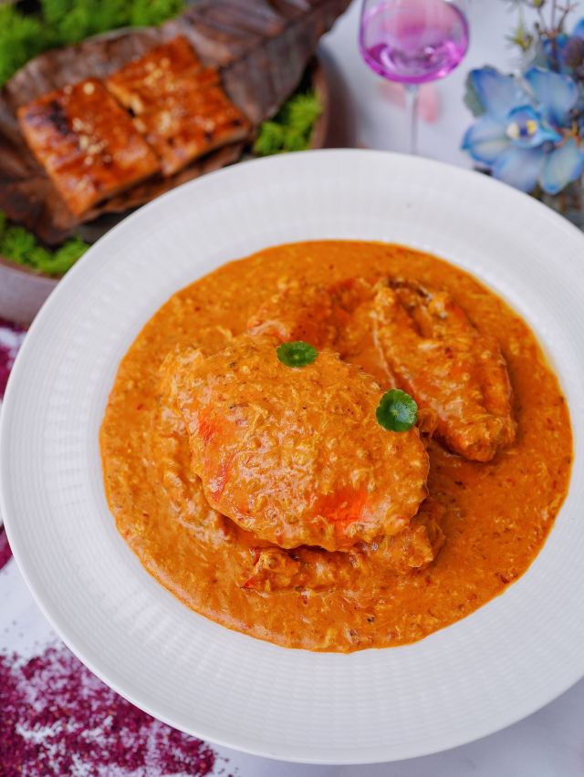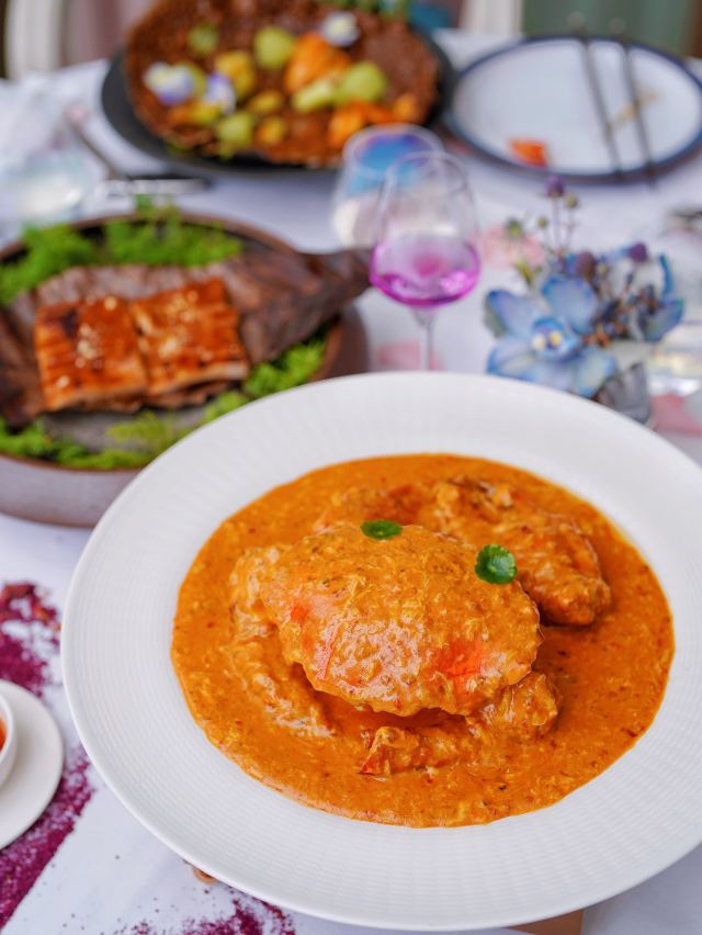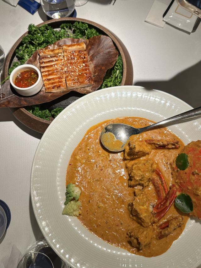 炭烧猪颈肉,古法咖喱肉蟹,虹吸冬阴功汤,黑松露烤鸡,古法咖喱大虾,飞天通菜,泰国皇室芒果糯米甜饭,餐前面包,青柠檬酸汤老虎斑,活力芽苗雪花鹅肝,咖喱蟹,炭烧熟成贝柱佐泰味柚子