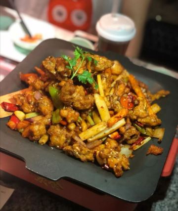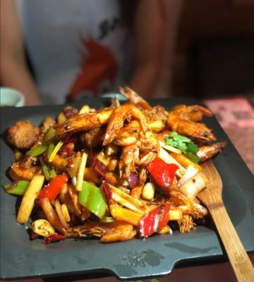 炭火干锅牛蛙,牛蛙是炸过的,酥酥的,味道还挺不错,不过觉得没有焖锅好吃。干锅鸡翅虾,虾是开了边的,挺入味的,鸡翅还挺不错,推荐。古法酸梅汤,吃完来杯酸梅汁还挺不错。
