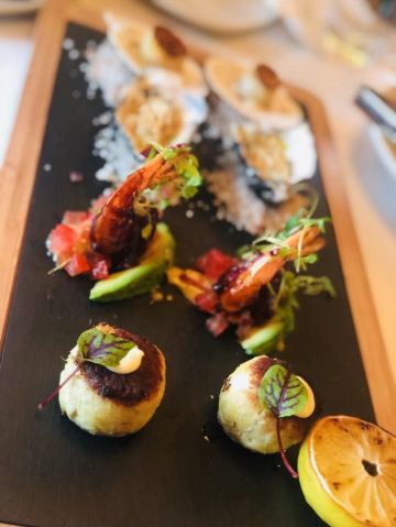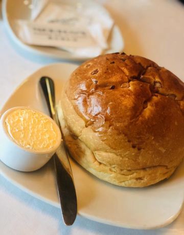 餐前大面包 这个面包是真的大,非常扎实,胃口小的女生感觉吃一个就饱了……搭配莫尔顿自制的黄油,不错哒! 珍宝蟹饼 圆圆扁扁没有脑袋,切开后容易散开,毕竟蟹肉不是很挺括~挤上柠檬汁更好吃,去去腥。