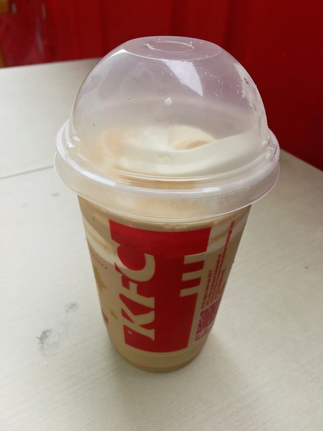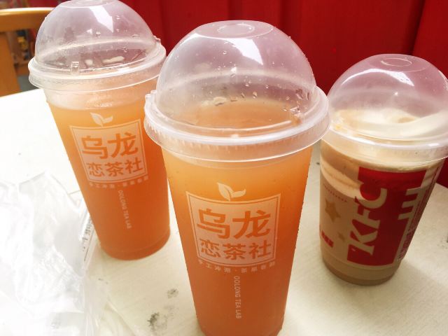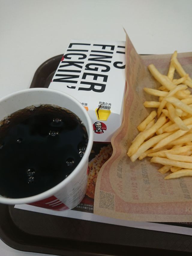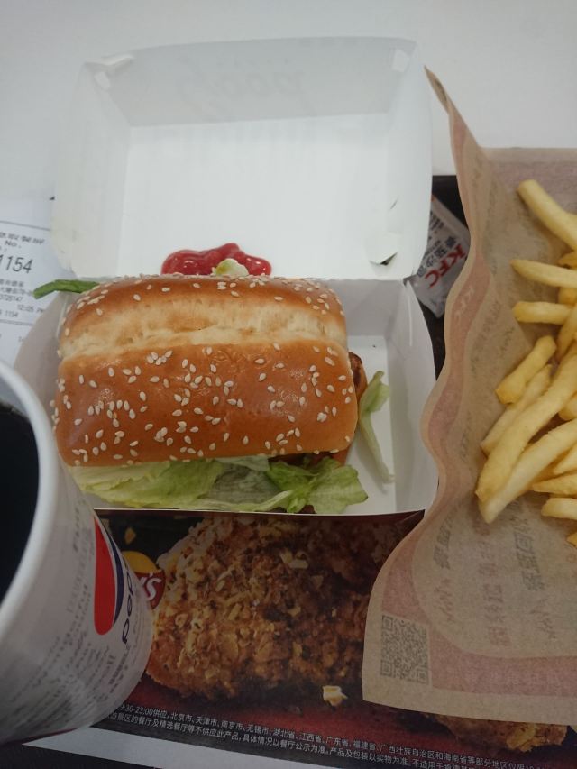 这家肯德基,就在我最喜欢的肠粉店旁边,吃完午饭,就过来买了,我最爱喝的恋桃乌龙茶和雪梨咖啡。 [环境]这家店虽然很大很大,但是人流量也是更大更大,里面永远都是满满的人,这次把我们都挤到了室外的用餐具。 [服务]人工服务也是很不错的,只不过排不起大长队,一般我都用线上点餐。但是那天线上系统有点问题,点餐之后没有购买记录,以至于也没给我积上分。