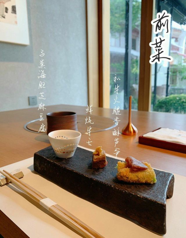 轻轻的一个蚊种草怀石料理已久,居然是在深圳拔草。茑山离家比较近,附近是锦绣中华,庭院很大看起来很有日式的氛围,中午刚刚坐了面对庭院的包厢,宁静祥和的一人食。 前菜 海鲜芝麻豆腐+马粪海胆 嫩滑香糯充斥着口腔,马粪海胆的鲜甜和芝麻豆腐的软糯口感很好的融合。 清炖牛舌 稍微的腥味配合芥末味味增酱,整个感觉很特别。 和牛火腿香酥芦笋 芦笋特别鲜,脆脆的,和牛火腿肌理感很强,不过芦笋真的特别出色。 和牛三种 烤牛肉真的是让人有幸福感的事情,肥牛五成熟肥肉的脂肪和微微灼烧的口感真的太美妙了。负责接待的小哥哥还告诉我如何搭配柚子黑椒和芥末一起吃不过我还是最爱吃鱼生酱油。芥末是自己现磨,一点都不辣。 和风牛肉御饭 不喜欢吃洋葱的人意外感受到洋葱的清甜,牛肉是西冷肉,米饭是越光米,吃起来很有嚼劲,铺上海苔芝麻。很完美的收尾。 本来甜品是冰淇淋,不想吃冰,给我换了柿子。