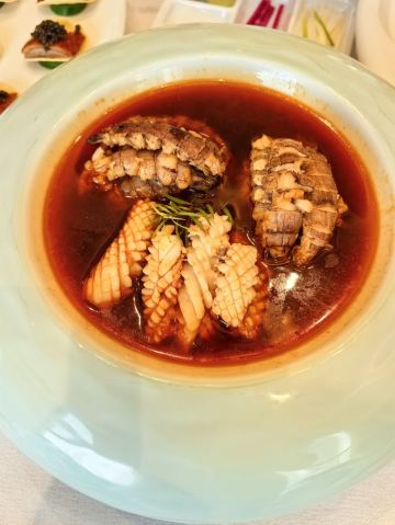 鲍鱼黑蒜汤,清油泡东星斑,香茅烤牛排,观海片皮鸭,盐焗花螺,观海私房鸡,麻辣虾蛄肉,八仙过海刺身,油盐焗天然黄花鱼,香煎豆腐,龙宫盛宴,鲍鱼