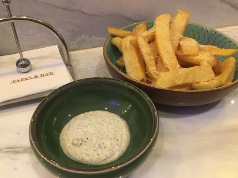 LAVO TAPAS & BAR为了最佳位置入座,一定记得提前提前预约,不然就剩吧台位等你啦。尤其圣诞🎄就在眼前,那肯定是要提前预约的啦。 循着台阶而下,灯火通明,似有那么些格格不入,又有着与城市夜晚基调的相融相配。华灯初上,城市灯光的映衬下,显得地方有那么些神秘又有些向往。 「黑松露粗薯条」 薯条其实大同小异,但是根根金黄却也是很有考究。最根本的可能是蘸的黑松露酱,黑松露应该是进行了改良,特有的馥郁味道被掩盖不少,同时作为蘸料也是很出彩。只是这个不能多吃,容易产生饱腹感。 「雞翅」 很普通的食材,却也道出了不同的做法。在深圳几天,几天之内也试过几次,但是做法相同,味道却不相同,自然好与较好肯定也有差异。这里的鸡翅没有那天在餐吧吃的好吃,但也不赖,有点微焦,总体还算OK。 「法国生蚝」 这个有点惊艳到我,一般生蚝🦪生吃要么交杂着海里乱七八糟的海水味要么总觉得生蚝的腥味太浓下口不易。但是,这家的生蚝滴上几滴柠檬,柠檬汁穿越过饱满肉质顺溜下滑之时,都可以听到喉咙咕咚咕咚的口水的声音。一口下去,充盈着齿间的顺滑感,后续的腥味不大,真真是不错,处理得也到位,现在想来依旧可以感受到舌尖在跳跃的快感。 「海鲜西班牙饭」 有过一次海鲜西班牙饭的不愉快经历,造成了一种美食上的恐惧。但是,还好克服了这个恐惧,最后补了这个西班牙海鲜饭。完全不是一个级别的呢!饭稍稍有点湿润,但是比较湿润的饭黏度高,粘合海鲜的贴合度好,所以也可以理解呢,谁叫味道还不错呢。 「香蜜桃鸡尾酒」 蜜桃鸡尾酒,透露着一股淡淡的蜜桃香,是鸡尾酒,又不似鸡尾酒那边综合味道尴尬,适合女生。 到这家店就犹如拆盲盒一般惊喜,每一样都是一种惊喜,每一样也都不会踩雷。