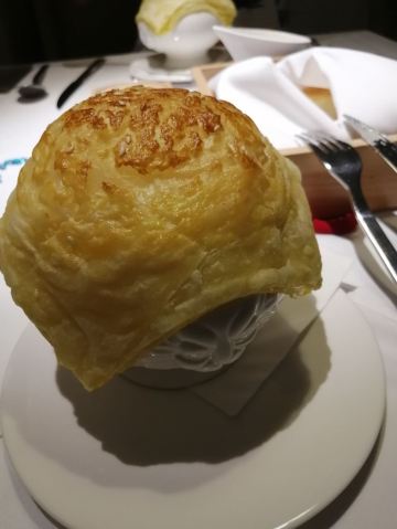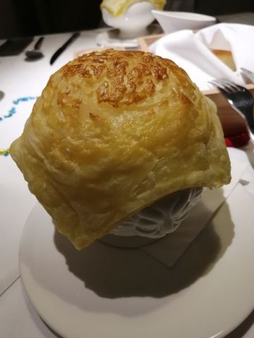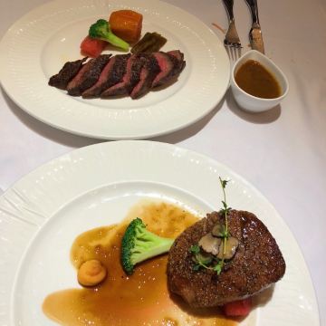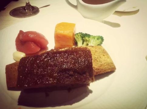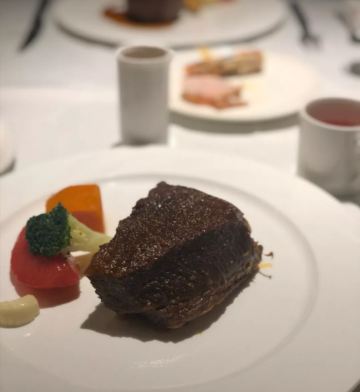 法式香煎鹅肝沙拉,香颂玫瑰露,蘑菇浓汤,酸梅汤,甜酒,热浓浆巧克力拉瓦,甜点,台塑牛排,餐前面包,蜜桃甜酒,法式蘑菇浓汤,酥皮海鲜清汤,酸梅汁,牛小排清汤,酥烤牛小排