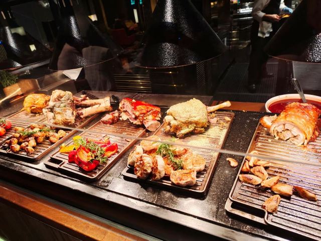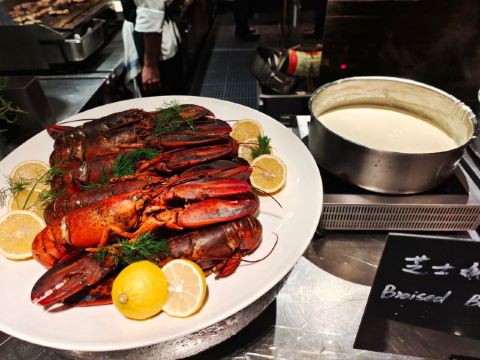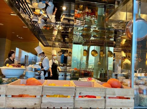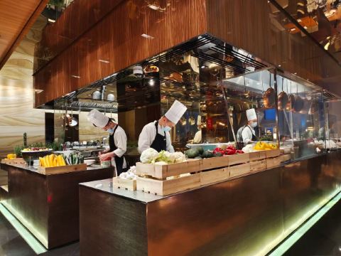 这是一家互动式自助餐厅,食客在用餐时还可以欣赏到各色美食的烹调过程,感受来自视觉和味觉的双重享受。餐厅设有五个独立的开放式厨房,提供中式、西式、日式料理,以及各式海鲜及甜品等。