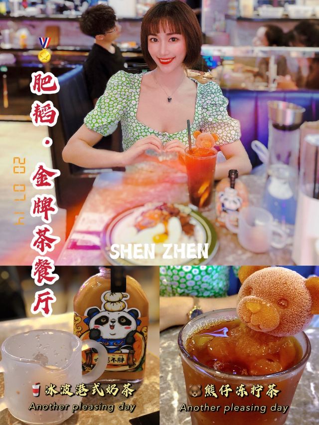 Vivian小丸子🔥深圳美食探店|🏅️香港金牌茶餐厅🏆福田top1👍🏻 - - 🔥茶餐厅热门榜·第一名🔥 🔥 肥韬·香港金牌茶餐厅(华强北店) - 💛看过TVB的这一辈,对港式茶餐厅一定情有独钟。说到港式茶餐厅,必然少不了菠萝油、鸳鸯奶茶、冻柠茶、漏奶华的存在‼️ - 📍详细地址:深圳市福田区振华路109 ⏰营业时间:08:00-24:00 🚇地铁线路:7号线华强北站D2出口 💰人均消费:¥70/人 - 🐻熊仔鸳鸯/小熊冻柠茶/小熊女朋友 💰26/24/26 金牌茶餐厅的特色,把鸳鸯奶茶、柠檬茶、西柚果汁分别用模具做成小熊的样子🐻小熊鸳鸯和小熊女朋友每日限量100杯😫卖完即止!! - 🍍港式菠萝油 💰3/10 茶餐厅提供菠萝包外带,3块钱一个良心价。每次新鲜出炉就会排长龙🐉在餐厅里的菠萝油卖价¥10,外带不同会给你夹一块厚厚的黄油🧈 - 🔥黯然销魂饭 💰39 说到黯然销魂饭,你们是不是也想起了周星驰星爷?这道菜完美地复刻了《食神》里的精髓[得意][得意] - ☕️港式奶茶 💰23 亲眼看见有个负责做奶茶的人拉出丝滑的奶茶👍🏻茶香浓郁的茶底没有被奶香味盖过,值得一试! - 💛漏奶华 💰35 踩雷了💣🤣一个餐厅难免总有那么两个菜品,切开并没有流下来的质感,味道也有点甜腻~ - 🥩黑椒牛扒双蛋饭 💰46 牛扒品质一般,46块钱一份我就不追究品质的问题了。优先选择黯然销魂饭哦!! - 💛除了食物以外,店面的装修风格有少许与港式茶餐厅相似,可以说是我们这一辈人的情怀!💡提醒一下各位去之前可以像我们一样打个电话留号,不然排队真的要等一个小时🤣🤣