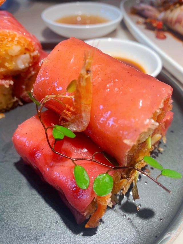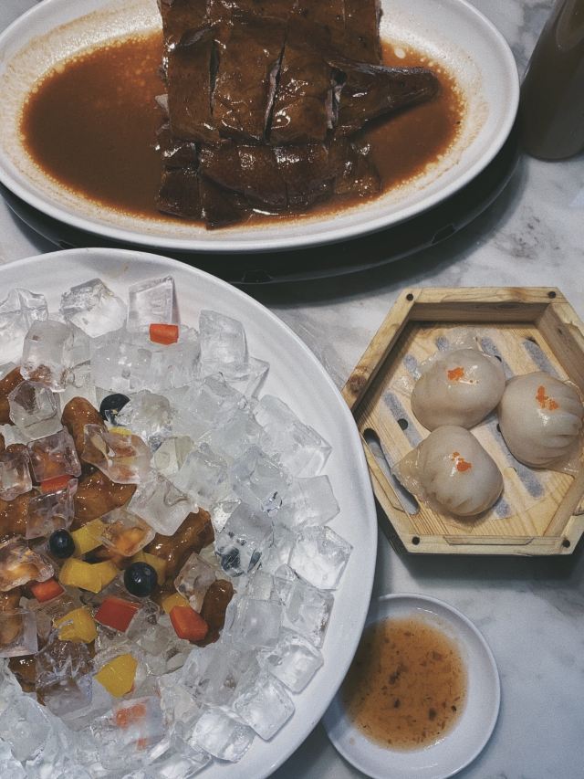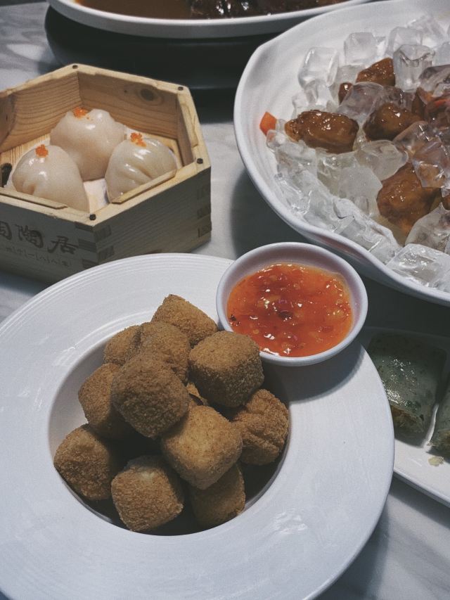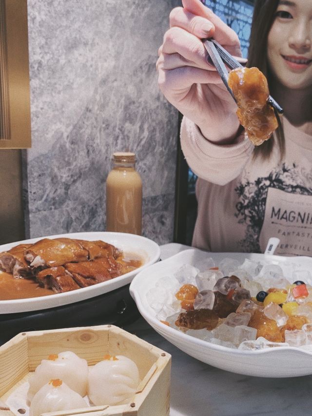 陶陶居大虾饺,卡珍芝士焗糯米鸡,一口酥豆腐,百搭酱皇蒸凤爪,冰镇咕噜肉,酥皮水牛奶菠萝包,烧鹅,红米肠,生菜煲,沙姜脆皮猪手