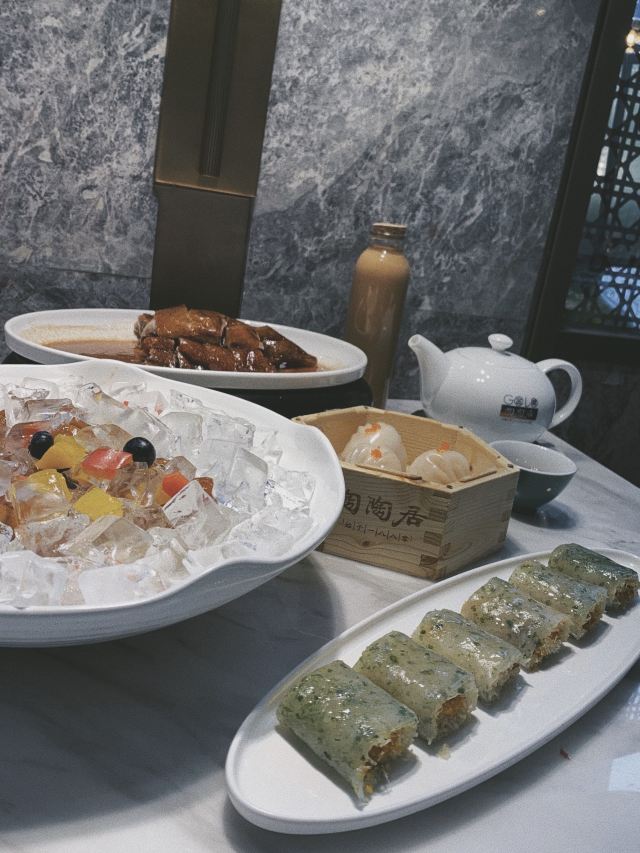 郭小鸬🛁【深圳探店】一城一店!深圳唯一家金牌陶陶居~ 一城一店的金牌陶陶居,深圳店开了!正好路过的我,怎么可以错过这个~! 百年中华老字号的金牌粤式点心,果然没有让人失望。 // 作为金牌陶陶居比普通版的陶陶居大气很多,岭南花园主题风格。 一城仅此一家哦! 被门口的巨大鸟笼卡座吸引,金牌陶陶居整个空间就是更具设计感。 香槟金与灰蓝色的莫兰迪色调,看起来更为高级和优雅。 // 全部茶点菜品都是每天百分百纯手工制作和现点现蒸,保证了出品的新鲜呐! // 挑几个我喜欢的推荐给大家吧: ✔️「陶陶居大虾饺」!!!招牌,进店必点!透过皮子就能看见超大颗的虾仁,内馅饱满,里面都是整个的大虾,虾仁个大,敲满足,不用多说它魅力吧! ✔️「陶陶居百年烧鹅」他家的镇店名菜,据说选用的是清远黑棕鹅,外皮烤得金黄酥脆,蘸上梅子酱,酸甜开胃。 ✔️「冰镇咕噜肉」对于酸酸甜甜的东西,我就是完全没有抵抗力!这个很大一盘,没想到冰镇的咕噜肉竟然是最好吃的!满满的一口肉吃下去简直就是满足! ✔️「一口酥豆腐」豆腐好吃的哟,外酥里嫩,这口豆腐是真酥,简直不能太好吃了 // ✈️用料也极为讲究,又新出了一些创意有特色的点心,每一道都是精品 而且服务态度也很好,上海店也开了,回上海也可以吃了~开心!!! // 【金牌陶陶居】 深圳市深南大道华润万象天地L1层SL186号 ⏰营业时间:09:00-22:00