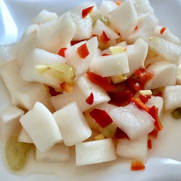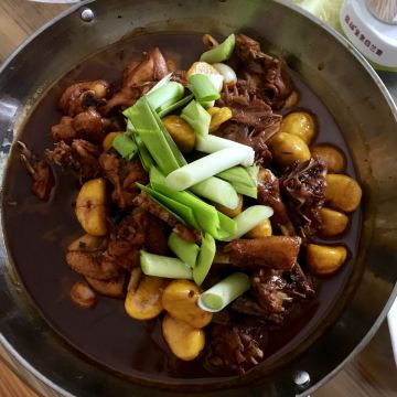 石台一品锅,萝卜,红烧仔鸡,栗子豆腐,清炒丝瓜,蛋汤,咸肉,小河鱼锅仔