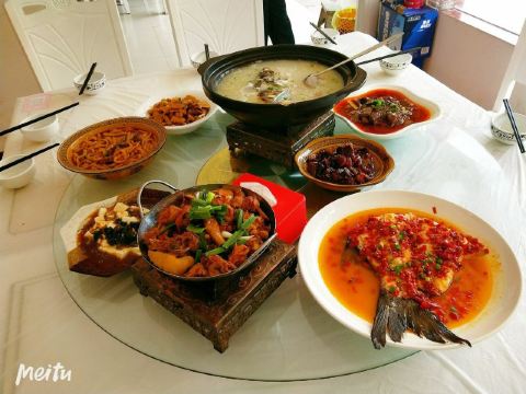 一鱼四吃,一鱼二锅,砂锅鱼头,蒿子粑粑,红烧土公鸡,铁锅鱼,一鱼二吃,干锅鱼泡,手工豆皮圆子,砂锅鱼头汤,美味虾糊,万佛湖砂锅鱼头