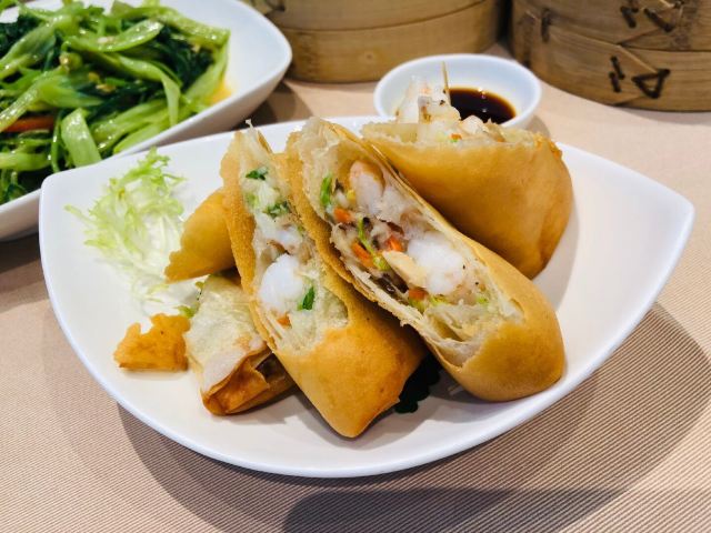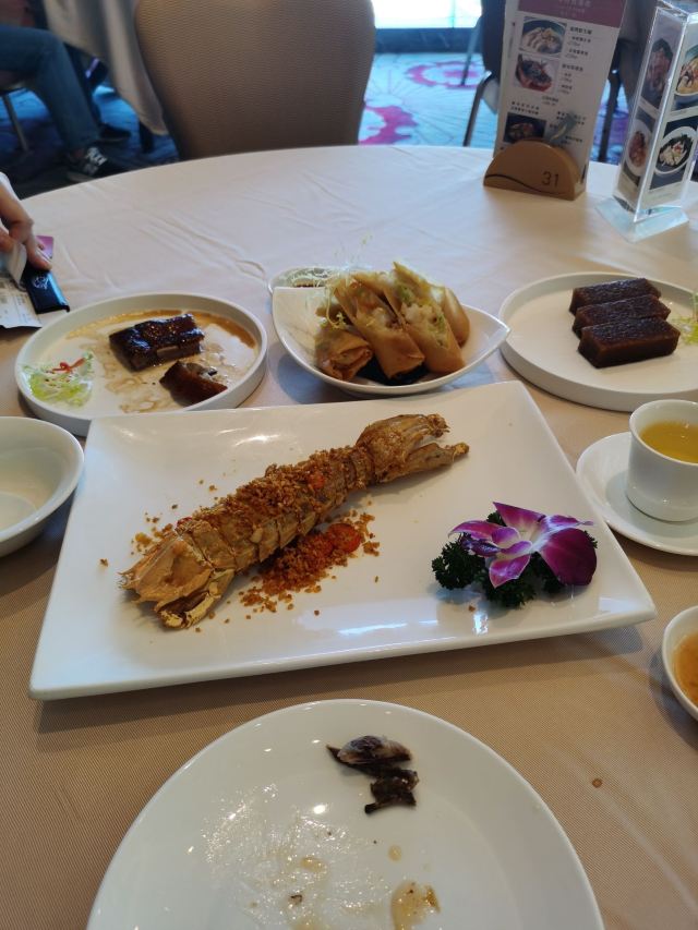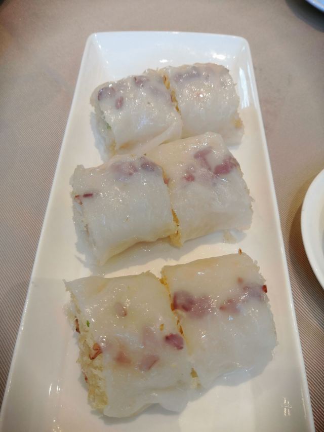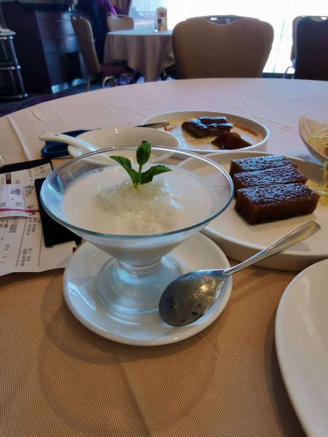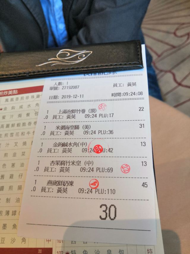 每一样都很好吃。 杏果腐竹米黄:没想到腐竹和白果做粥如此好吃,虽然不是荤的,粥熬的很糯,非常香。 上汤泡鲜竹卷:腐竹里面包的内容很丰富哦,汤也好喝。 咸水角:里面应该放了萝卜干、肉等,特别美味。 米网海皇肠:里面炸的焦脆,外面米皮软糯,很完美的结合。 燕窝鲜奶冻:奶味很足,,加燕窝是很美味的补品。