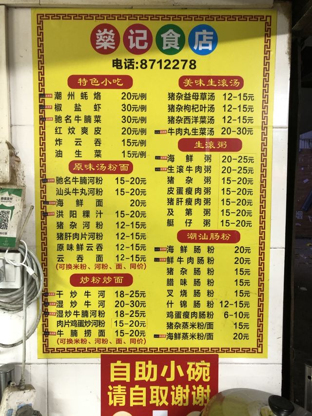 干炒牛河,湿炒牛河粉,潮州蚝烙,海鲜肠粉,椒盐虾,猪杂枸杞叶汤,猪杂益母草汤,洪阳粿汁,生蚝肠粉,猪杂蒸米粉,什锦肠粉,瘦肉蛋肠,叉烧云吞瘦肉河