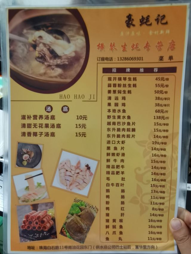 Helen晓世界《晓世界》之国内环游篇📍广东 这家店距离住的酒店步行一公里,出发的时候在线排了号,前面有八桌,本以为等走到就差不多了,结果到了以后才进了三桌,虽然是周六,但已经晚上八点啦,最后一共排了一个小时才吃上,出来十点了还有人在排队,生意是真好,门口不停的在开蚝。 【环境】跟我预想中不太一样哈哈,老居民楼底商,上下两层,一共可能就十几桌,怪不得排队进展比较慢。设施真的很老旧了,店里也有点热,讲究就餐环境的恐怕接受不了哈。 【服务】服务倒是很热情周到,耐心介绍吃法,估计看我们是游客怕不太会吃,虽然客人很多,还时不时的进来看看火候好提醒我们。店里还有颜色相近的一猫一狗,一直在门口懒洋洋的,可可爱爱。 【口味】真心不错,也算没辜负排队和忍耐环境了哈。而且价格很实惠哦。 锅底选了|清甜无花果汤底^,毕竟椰子的以前吃椰子鸡尝试过了,无花果做火锅底倒是真第一次见。还是没有让人失望的,确实有一种清甜的味道,而且无花果居然最后煮熟了也挺好吃的。而且一份锅底才15块钱,真的很实惠。 鸡肉有两种,店家说|清远鸡^比较嫩滑,|果园鸡^比较Q弹。如果人多的话,就可以各点一份尝试一下啦,我们只有两个人,权衡了一下还是选了清远鸡。吃下来感觉果然选对了,这个鸡肉真的是非常非常嫩啊!而且油脂比较少,一般我吃鸡的时候不吃鸡皮的,但是这个鸡皮的感觉没有什么鸡油,薄薄一层,吃下去还是比较清爽的。 至于招牌的|现开横琴生蚝^肯定是每桌必点了,但是这个口味因人而异吧,先生觉得非常好吃,可以一口气吃半打,但是我就吃了一个,觉得还是有一点点腥味,需要粘重料才能够盖住。不过生蚝本身确实够肥厚,一口咬下去还是很有满足感的。 |东升脆肉皖鱼片^网上推荐的人也挺多的,但是我觉得这个菜有点失望,这种鱼经常出现土腥味,我们这次吃的也不例外。 至于其他的常规火锅涮料,因为我们晚餐前已经吃了太多其他东西,就没有点,个人感觉还是把有限的胃部空间留给最特色的食物吧。店里大部分的食材都可以点半份,这个真的非常友好,也可以减少浪费。