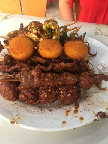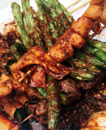 桂林正宗油炸王位于正阳步行街~小吃街入口处~不论荤素,五元起底/串。串的量还对的起这个价格,毕竟是在步行街。里脊比较嫩滑,丸子外酥里嫩,第一次吃干炸藕片。本来就是油炸过的豆腐再复炸,酥脆。酱料是微辣也是很辣的爽歪歪。
