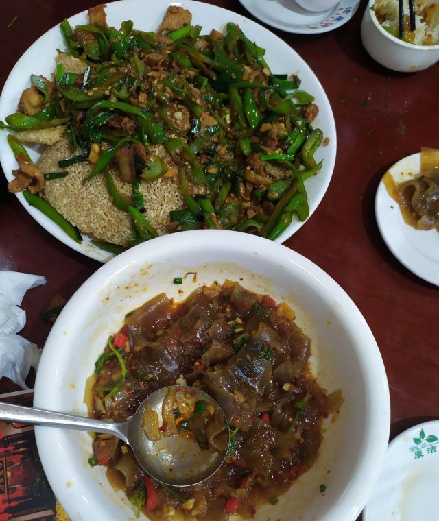 旅游去到湖南,这一站来到了洪江区,洪江是属于怀化市的一个区吧,具体我也不太清楚。当地的朋友带我过来洪江古商城游玩,晚上就在古商城里面唯一的一个餐厅用餐,从景点的大门走进去,第一个路口往右直走,见到一个类似龙门客栈、门口挂了一面旗子的地方,那里就是餐厅了。餐厅的一楼是大厅,有散台,装修看上去好像是饭堂一样,二楼是包厢,大大小小的包厢适合不同人数的团体用餐。 要说一下的是,这里的菜品碟头非常大,用料真的很足,每一碟菜都是大大份的,让你看得又爱又恨,爱的是太划算了,同样的价格,收到的食物这么多,通常没有人嫌分量多的,就只有嫌分量少,恨的是分量太多了,不可以多吃几种不同的菜品,又或者是点多了要浪费,可惜。出品味道很好,做的都是湖南风味菜,以辣为主,也有不辣的菜,或者你有特殊要求的,在点菜的时候一并提出,服务员的态度都很好,他们基本上都可以满足客人们的要求。上菜速度很快,一会儿就放满了桌子。血扒鸭是特色菜,我吃了几块鸭子,感觉也不算太辣,可以接受,最重要的是鸭子很新鲜,也没有臊味,而且块块都是肉,没有什么骨头。上汤皮蛋青菜,虽然算是广东菜吧,但是上汤的味道挺浓的,青菜也吸收了汤汁,变得很入味。这家餐厅值得推荐。