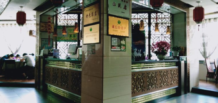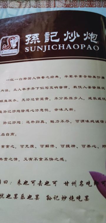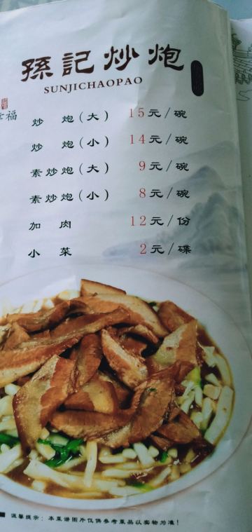 古藤幽兰孙记炒炮,名店,西大街和县府街十字路口拐角处,上二楼,店面不小,卫生干净清爽,凑巧没人,享受了一下优质服务,戴着高帽的厨师,耐心地帮忙先选了两小块精排,又挑了一小块牛肉,再加一个猪手,分别称重,43块钱,另加一大碗素炒炮,服务台付费,齐活了。面汤,筷子,肉,炒炮,在我忙于剥蒜瓣的时候,居然通通都是服务员帮忙端过来的,受宠若惊的感觉。肉都是烂乎的,排骨肉不多,啃个感觉,解解馋而已,猪手不错,口感新鲜,味道鲜美,略有凝结成冻,火候正正好,恰恰是我喜欢的,牛肉切得很厚,看来很有自信啊,不过确实软烂入味,也很新鲜,没有异味,炒炮不必说了,主打产品,虽然明明知道就是面做的,还是不一样的口感,我不大吃面,炒炮还是喜欢的,个人感觉,这家店能开这么久,口碑一直还不错,还是有实力的。已经连着来吃两次了,不谈服务,只说味道和价格,我是非常满意的。