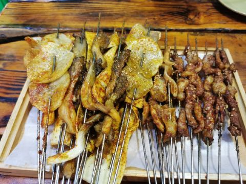 嘉峪关的烧烤特别出名,曾经上过很多电视节目,最近几天已经连续吃羊肉了。 所以打算吃一家,找来找去,经过筛选有一家是非物质文化遗产,但另一家是多年老店。 经过查询,当地人都比较推荐这里,富强市场里面的董军烤肉。 这边的肉都是按把卖,师傅见我进来,直接就给来了一把,一把是20只烤串。 嘉峪关的烧烤料放的料比较重,感觉没有吃出来太多羊肉的味道。 人均不到100,还是挺合适的。 有一个当地特色饮料,叫大窑汽水喝着就是橘子汽水的味道,可以尝试一下。 不过就是都吃完了,腰子一直也上不来。 就餐环境可以说是非常一般,因为就在一个连贯的大市场里面。 所以对卫生挑剔的朋友,请选别家。