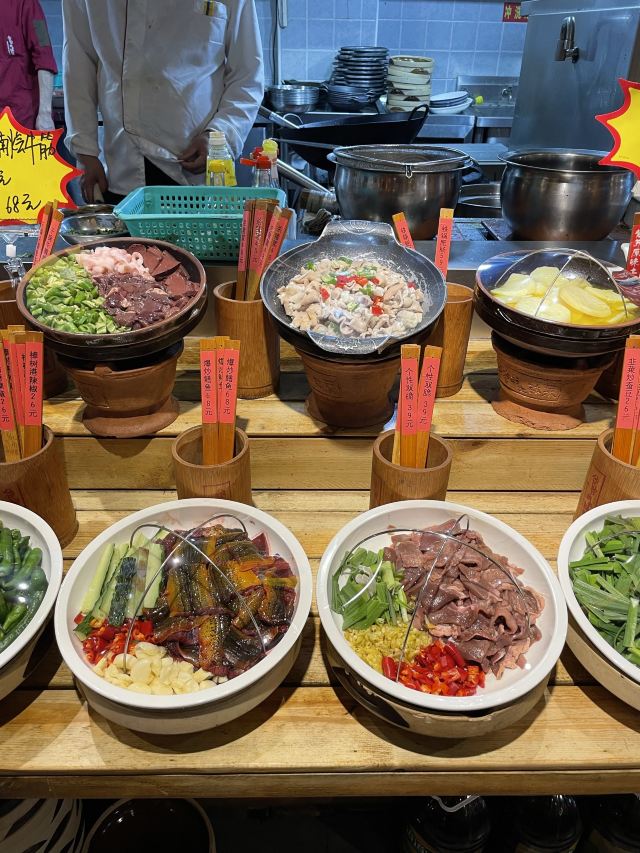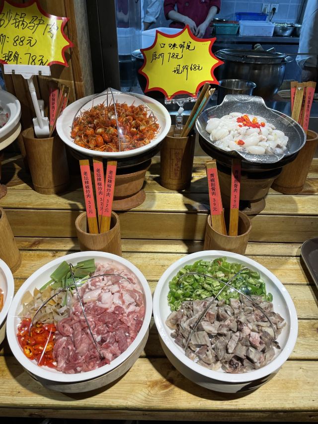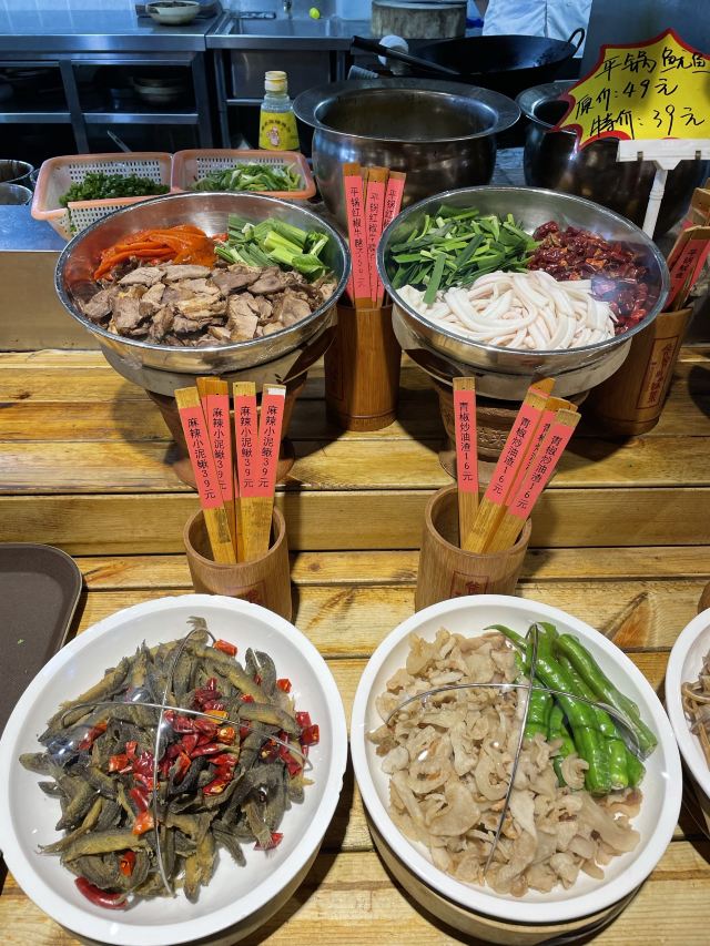 养生豆皮,千丝饼,平锅红椒牛腱子,辣椒炒肉,平锅鱿鱼须,藕汤,时蔬,石门肥肠钵,土钵黄骨鱼,酸豆角鱿鱼卷,蒜蓉粉丝蒸秋葵,双色鱼头,海带排骨汤,养生豆,夫妻肺片,猪尾巴