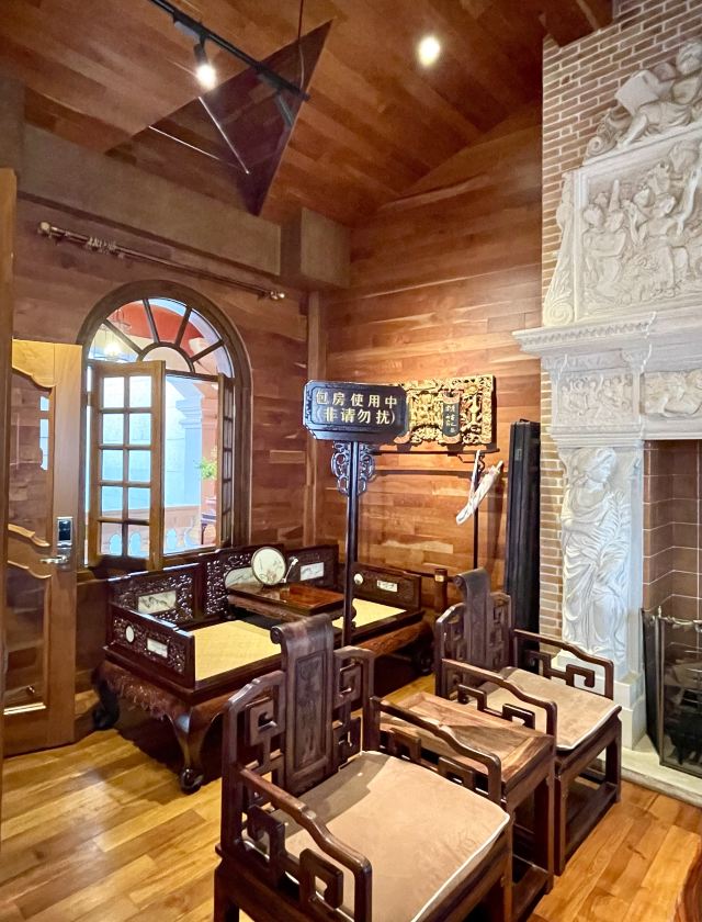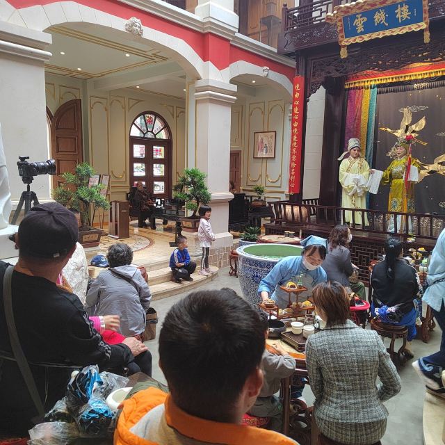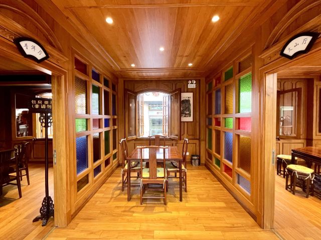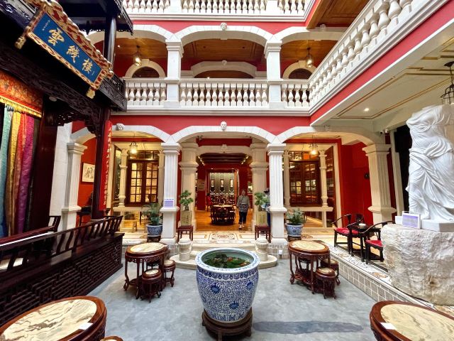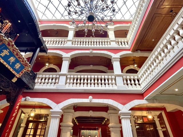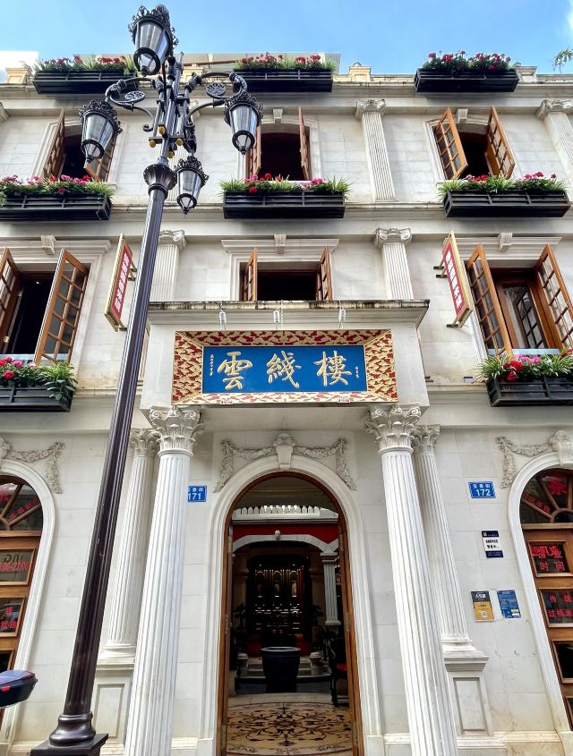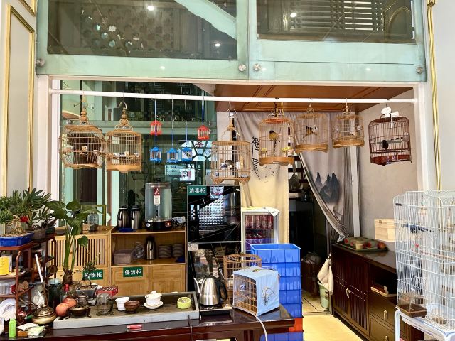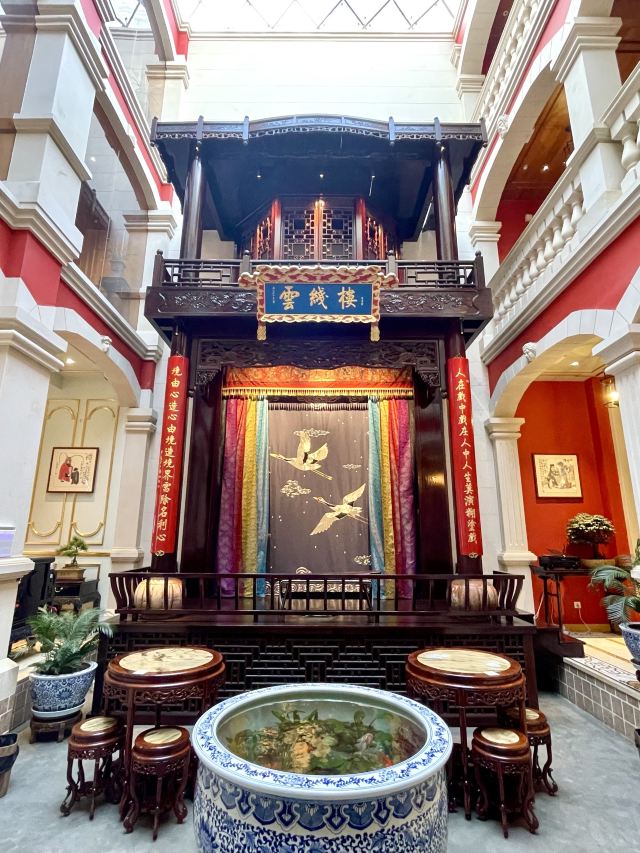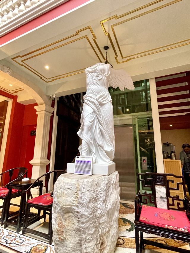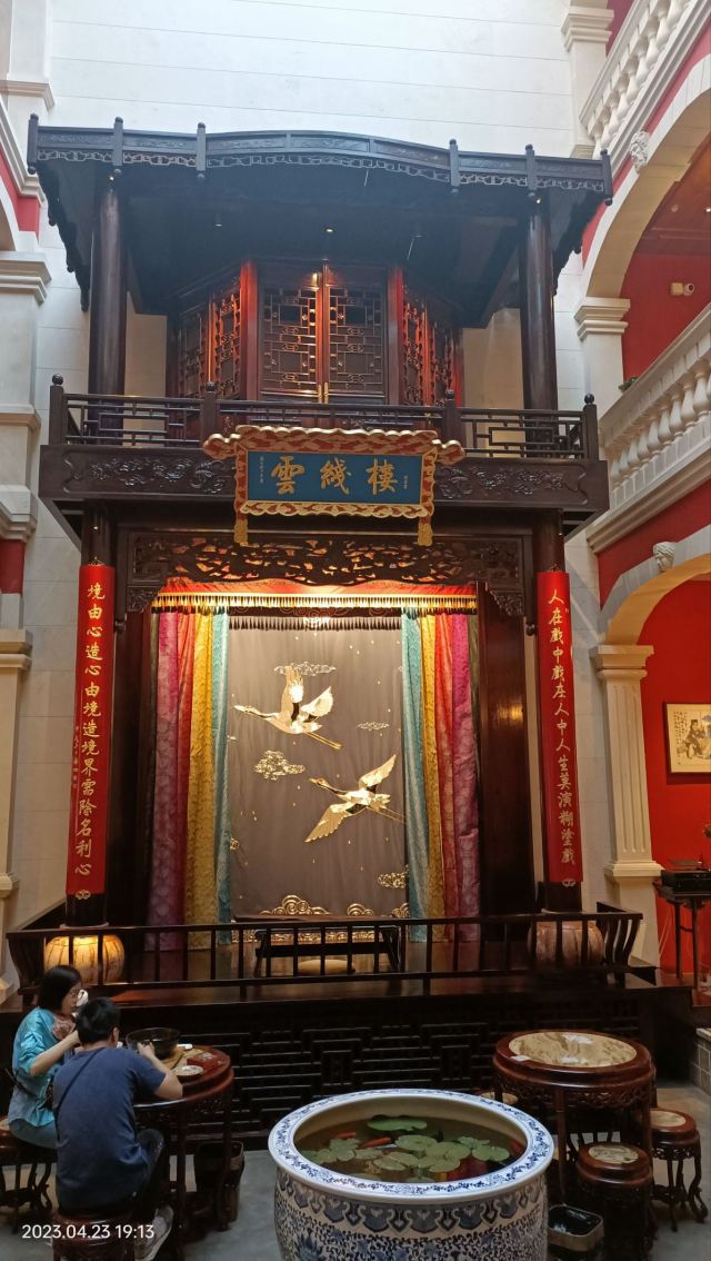 很有特色的一家老茶馆,中间的双层大舞台特别引人瞩目,喜欢这种氛围和风格,共有三层,还装了电梯可以直达,二楼和三楼分别设有几处不同种类的包房,平台上还有露天位。 天井和大厅分布着散客位,极富年代感,开放式厨房可以看到菜品的制作过程,不管是米线套餐还是茶饮价格都比较亲民。 进门的工作区域养了很多的小鸟,叽叽喳喳叫个不停,每层的楼梯拐角处都挂着鹦鹉🦜,很好玩。 舞台的对面居然是一座风格迥异的西洋雕像,耐人寻味。