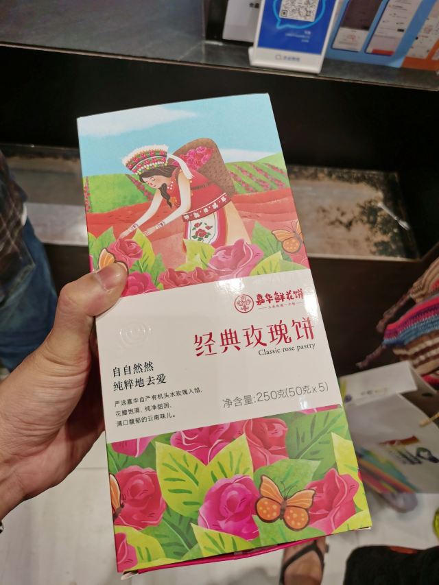 吴青芸据说是云南鲜花饼的头块牌子 不管是游客、还是当地人 都有极力推崇他们家的鲜花饼 店铺内 生意火爆,经常性排长队 找到店长 可以要到 企业微信号 也可以微信订购+快递,这样也不用负重进出。 鲜花饼 嘉华的 都是头水鲜花 出品诚意满满 ,新的品种也是层出不穷:茉莉花、可可、红酒🍷…… 樱桃玫瑰鲜花饼 我买了 樱桃玫瑰鲜花饼 试吃一下,再准备伴手礼购入。饼 新鲜 ,玫瑰味满满,饼皮香酥,饼的顶端 嵌着樱桃。就是 略略 甜了点。 云南大多点心有点甜,云腿小饼 更甜~~