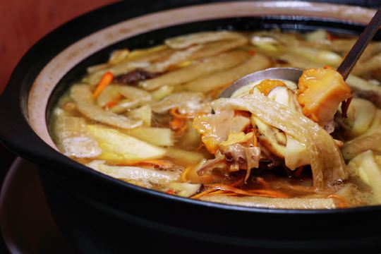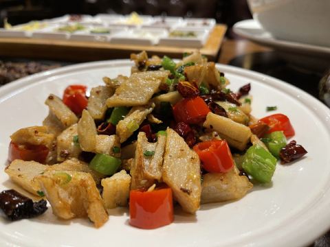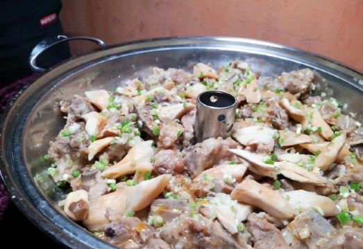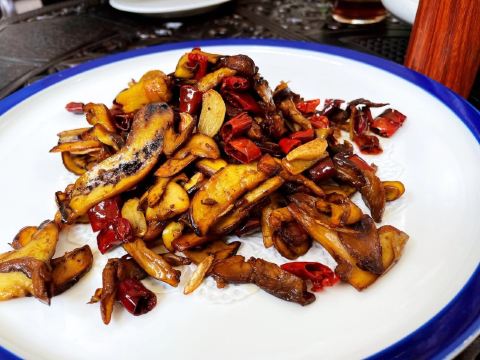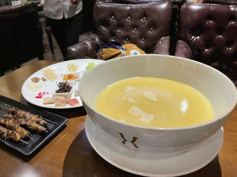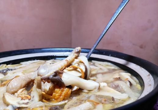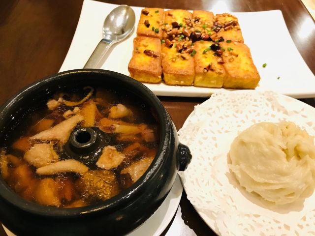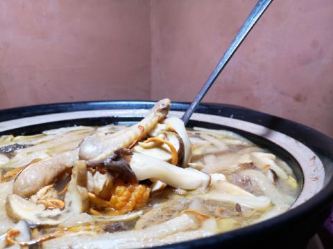 老昆明传统破酥包子,过桥米线,现烤宜良小麻鸭,碳烤牛肉串,香煎自制豆腐,干椒牛肝菌,老奶洋芋,清炒芥兰,招牌黑松露汽锅茶园鸡,汽锅鸡,牛肝菌焖饭