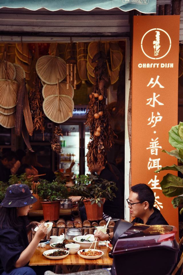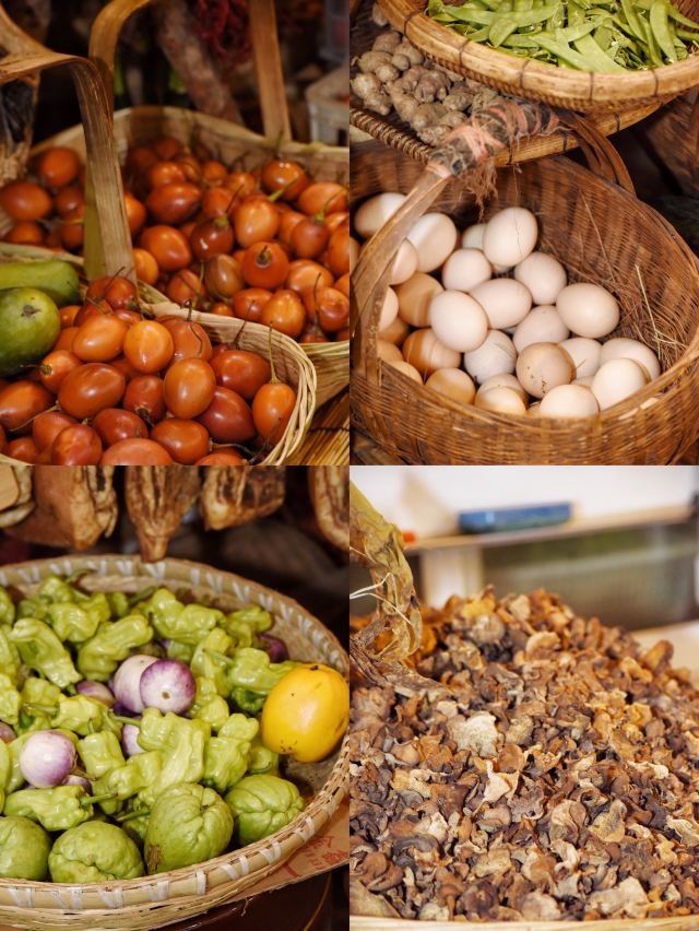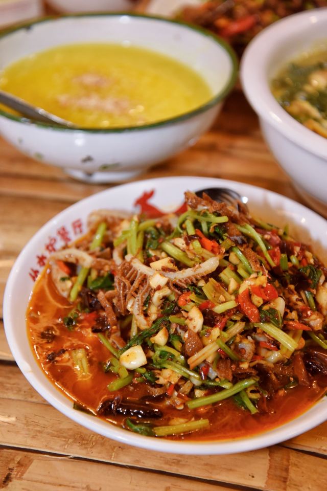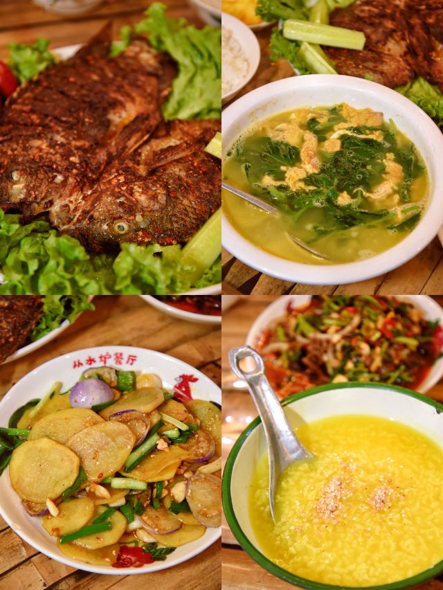普洱炝黄喉,普洱小炒鸡,野佐料炒牛肉片,番茄炒水蕨菜,冰稀饭,臭豆腐煮鱼,酥炸普洱茶排骨,麻辣洋芋片,喃咪烤鱼,土鸡蛋腌菜炒饭,农家芭蕉花