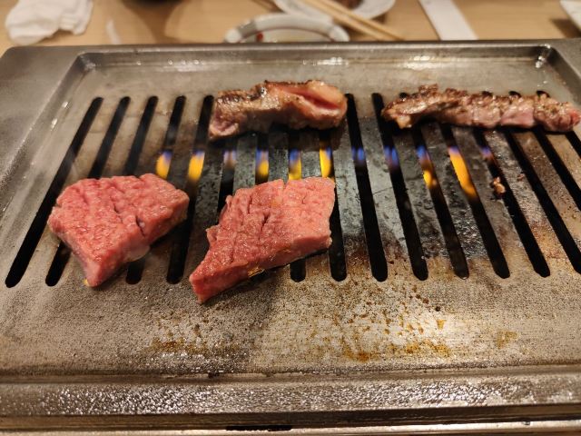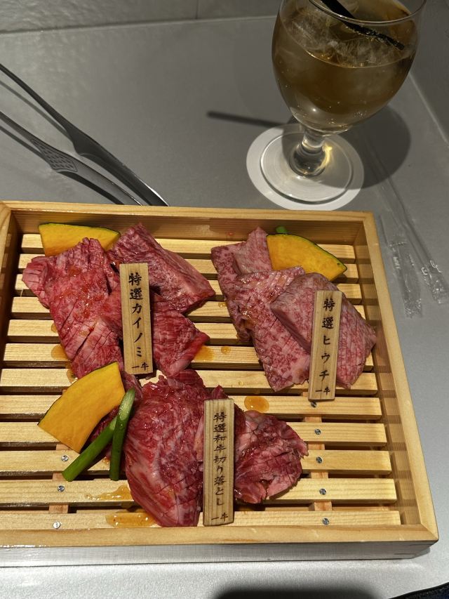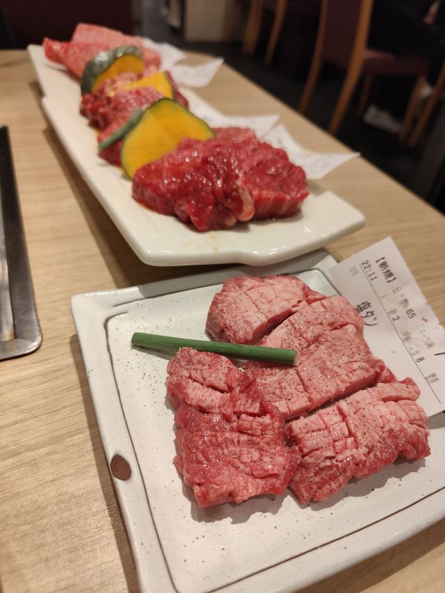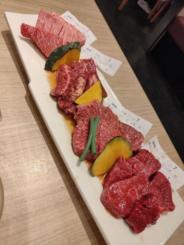 在心斋桥人气挺旺的一家吃烤肉的店,环境很不错,所处位置闹中取静,店里充满着昭和气息,是约会享受生活的佳处。服务员很热情,会向客人推荐,如果当天店里有肉质比较肥的,也会提醒你。完全自助烤肉模式,几分熟自己把,肉切得很厚,无论烤多久肉质都很嫩,霜降牛肉真是美味!店里的透明橱柜里还会展示大块的生牛肉,纹路清晰,看着就新鲜无比,这里的黑毛和牛都是从各地严选而来的,以最实惠的价格可以品尝到最高级的食材!