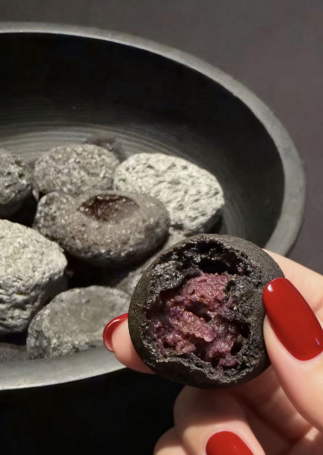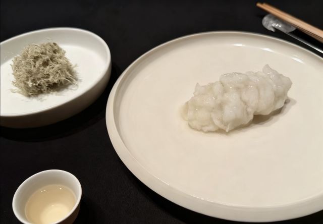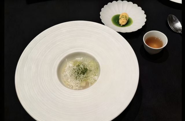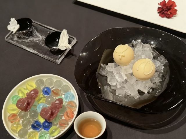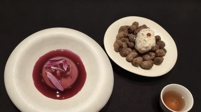 血肠团子,奄美大岛猪肉,白巧克力混合果汁球,蟹肉椰子玉米片,红鰤鱼配茴香和羊栖菜,豌豆茶碗蒸,海鳗
