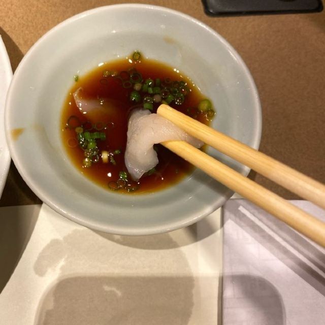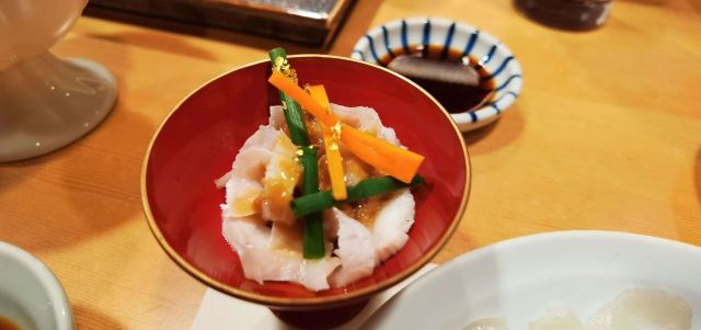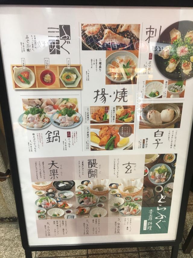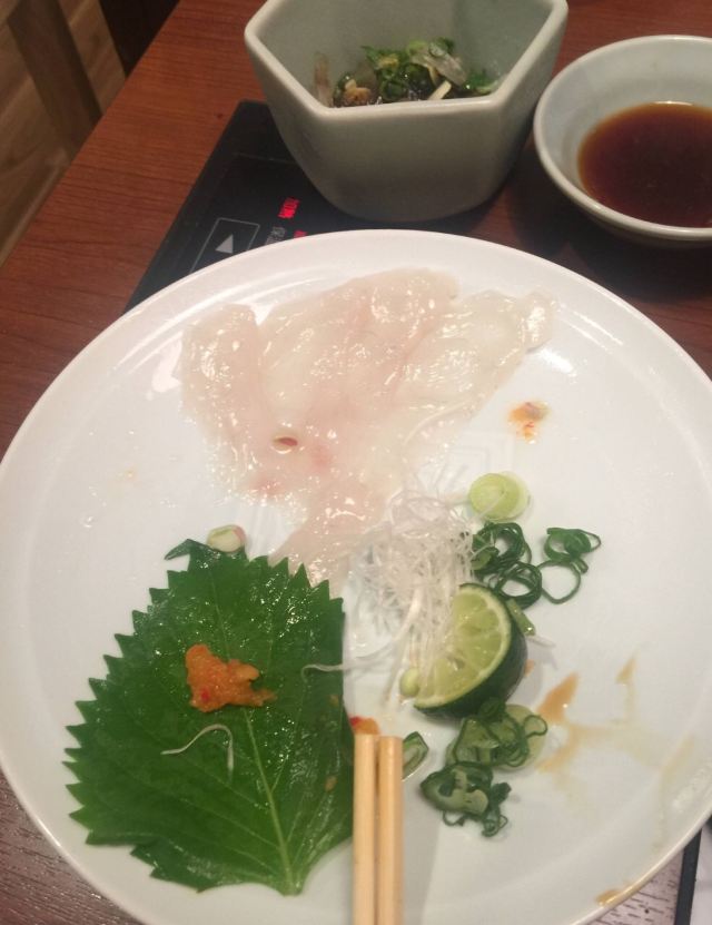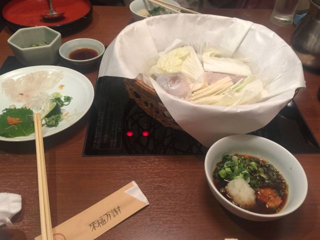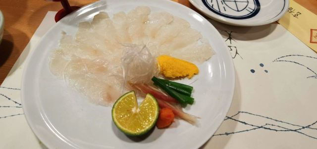 日本人也常去的河豚料理店,河豚肉吃起来很有韧性,河豚鱼刺身切的很薄,入口感觉依旧厚实,河豚鱼火锅里有蔬菜、豆腐、河豚鱼肉,味道鲜美,最后的柚子味冰淇淋清爽无比。